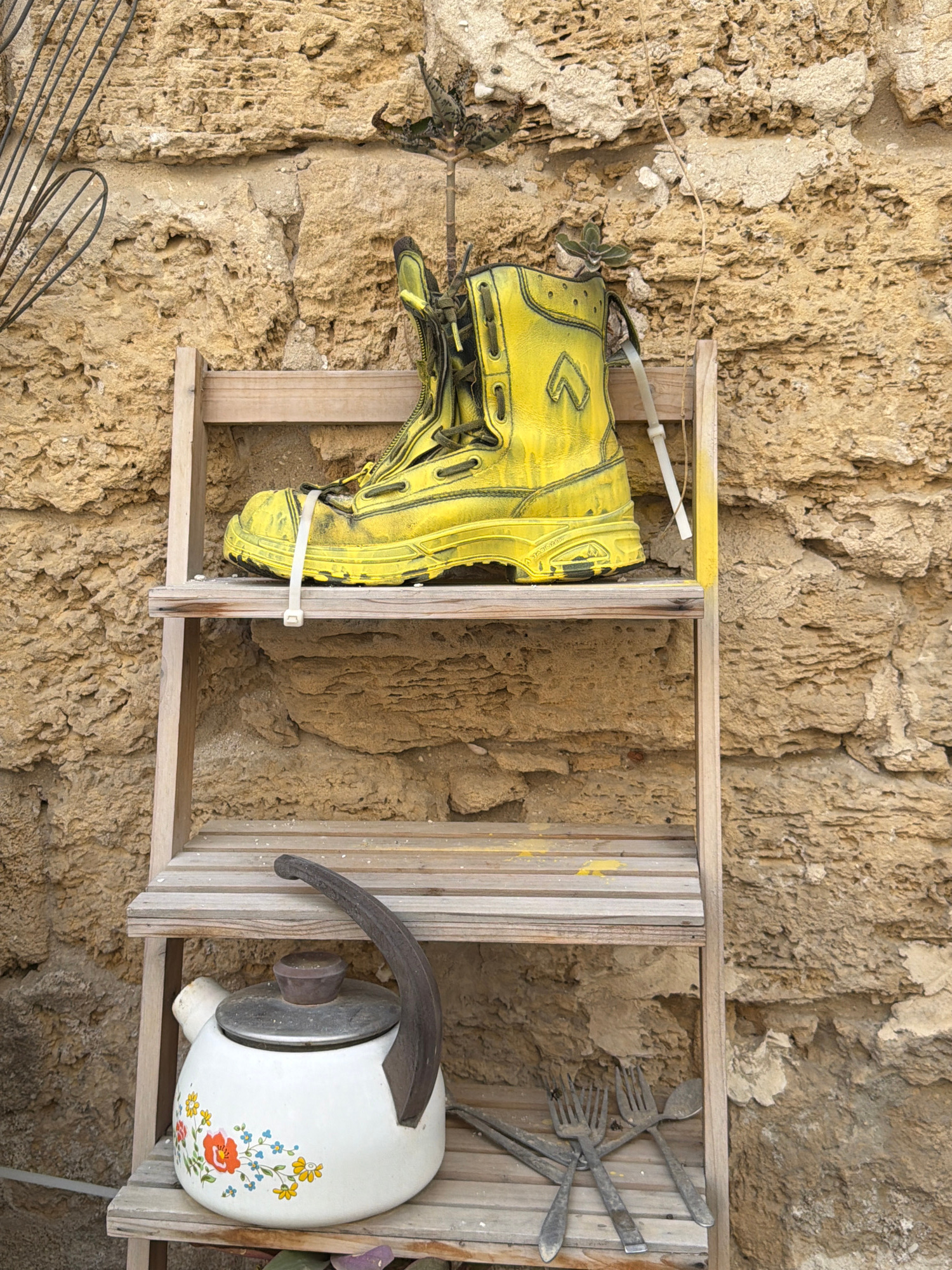 A vertical shot captures a rustic, charming display of repurposed household items against a heavily textured, light brown stone or concrete wall. The wall, possibly an aged building facade, shows sign…read more