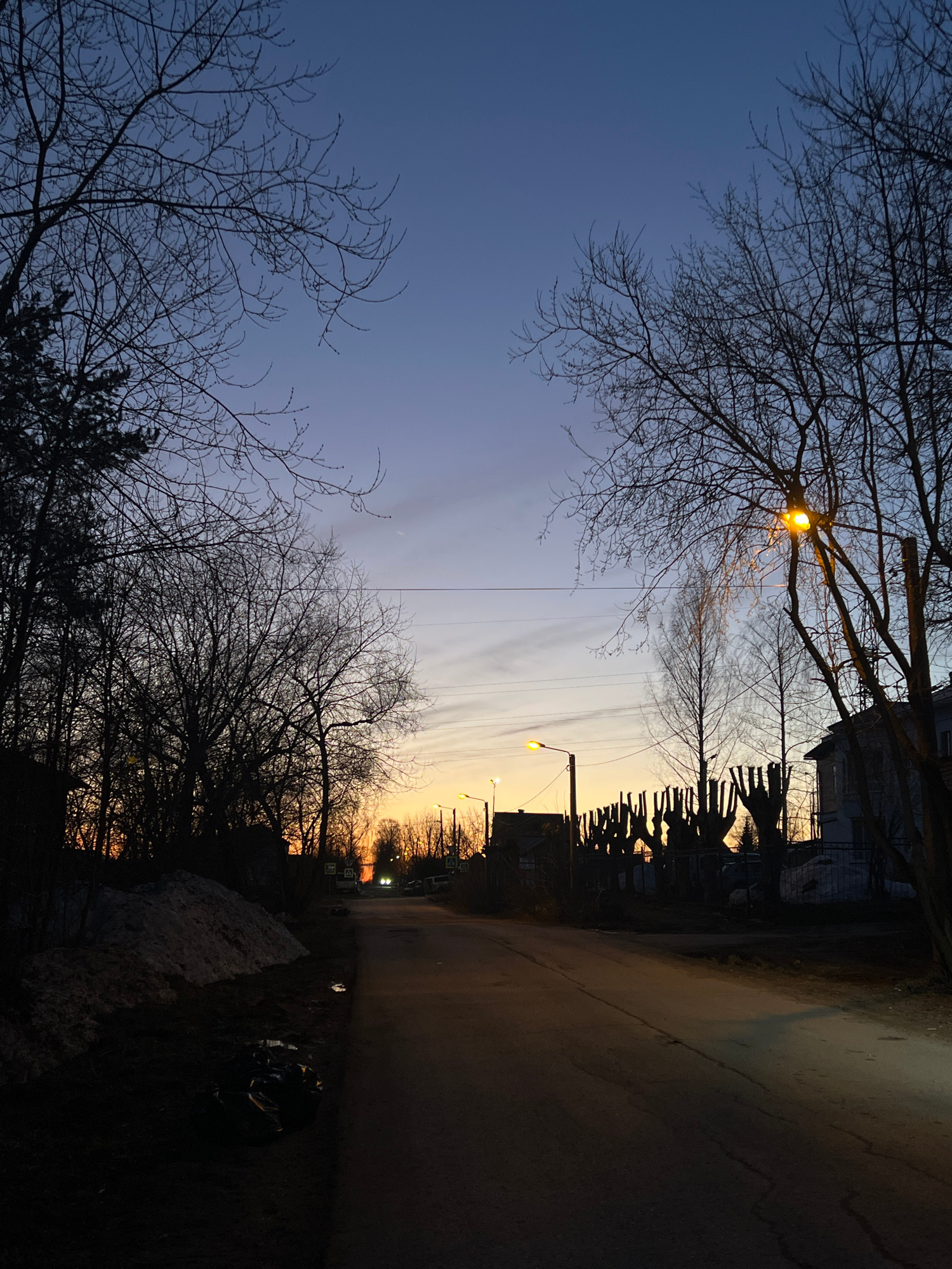 The image depicts a street scene in Berezniki, Russia at twilight. The sky transitions from blue to orange and yellow near the horizon. Silhouetted leafless trees frame the sky. Overhead power lines s…read more