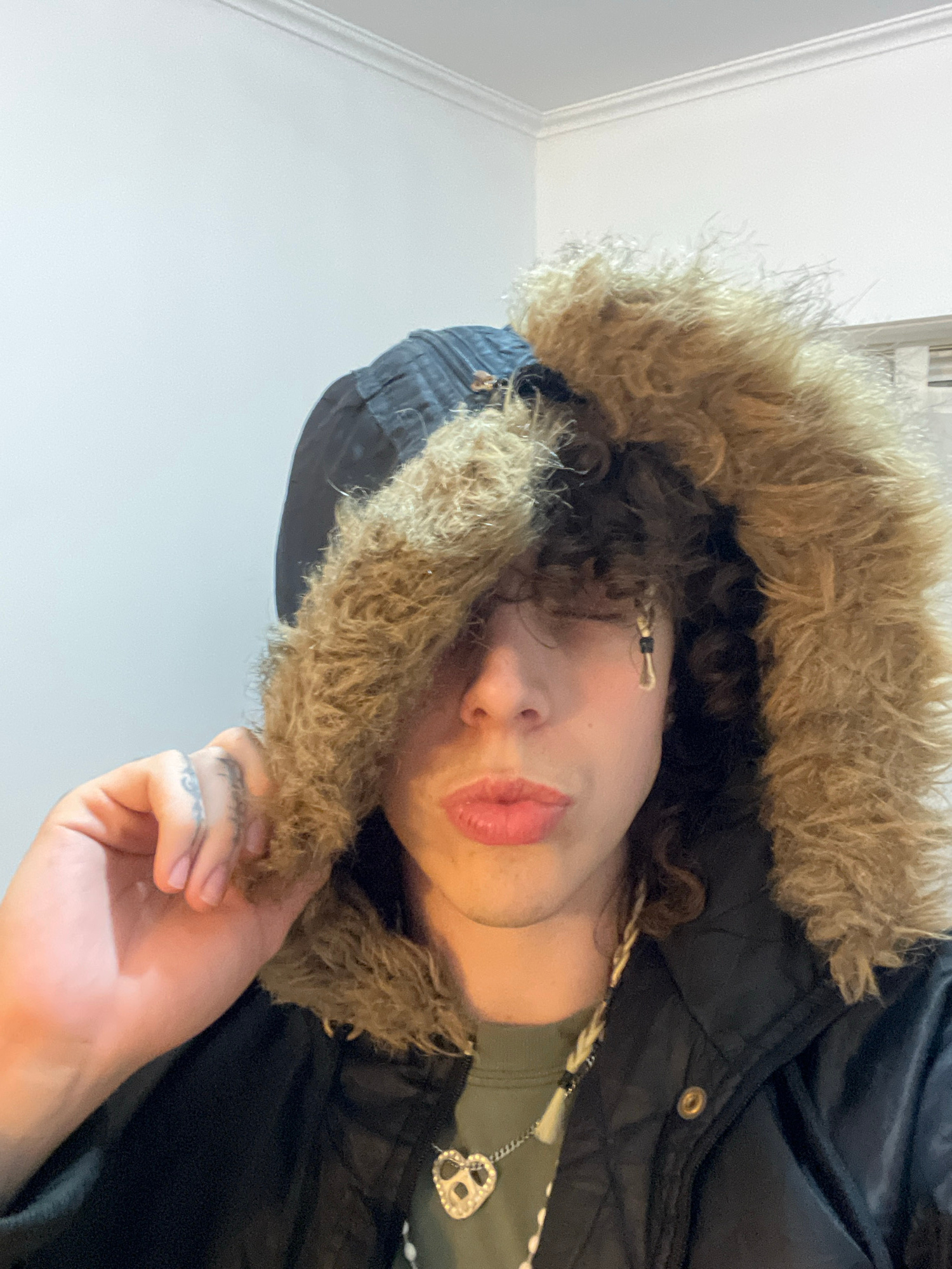 A low-angle, slightly rotated close-up shot shows a person wearing a black hooded jacket with a faux-fur trim. The person has curly brown hair, and part of their face is visible, including their nose…read more