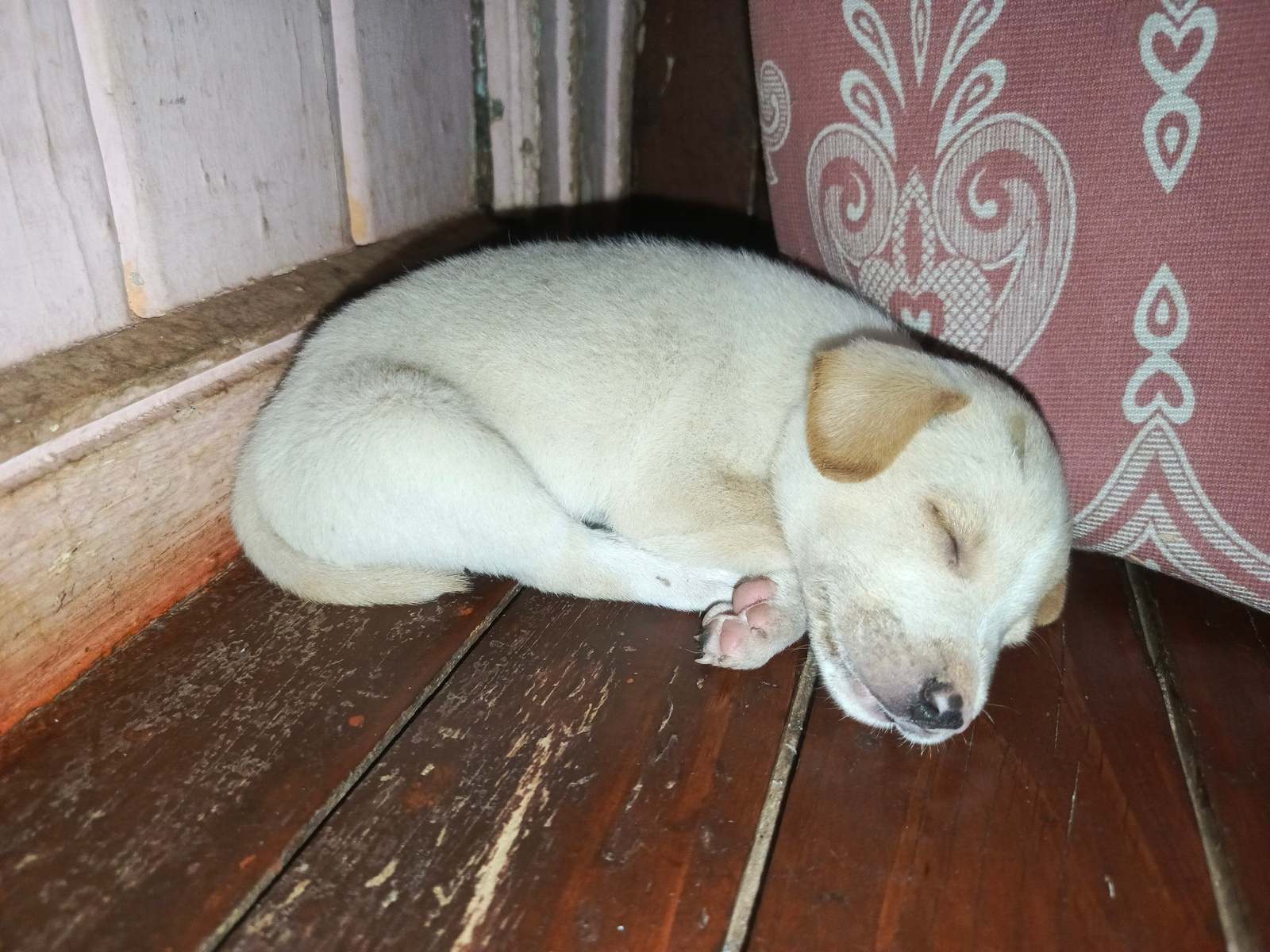 A light-colored puppy is curled up asleep on a dark, stained wooden surface. The puppy has tan ears. The background includes a pink pillow with a white design and a partially visible wall with peeling…read more