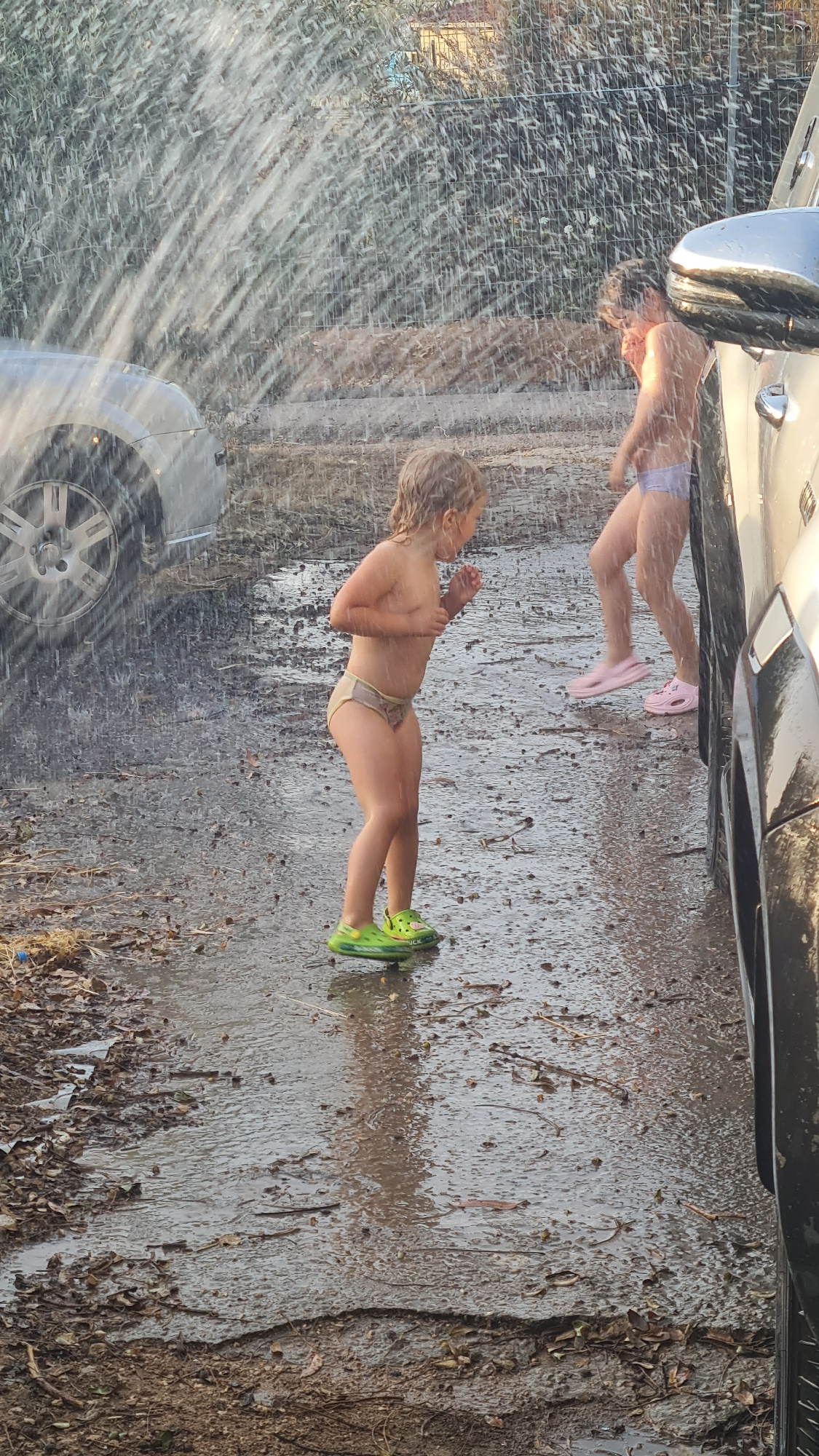 The image captures an outdoor scene featuring two young children playing in water next to vehicles on what appears to be a muddy, wet ground. The photo is taken in bright daylight, casting reflections…read more