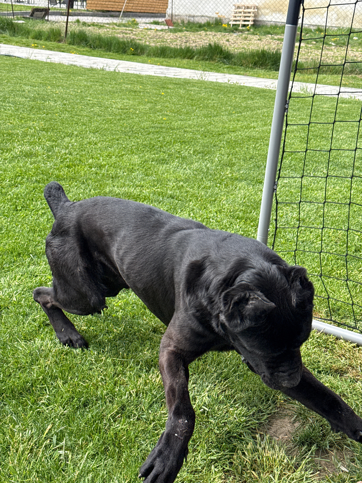 A large, black dog, possibly a Cane Corso, is the central subject of this image, lying relaxed on a vibrant green lawn. The dog's body is stretched out, with its head and front paws towards the top leβ¦read more