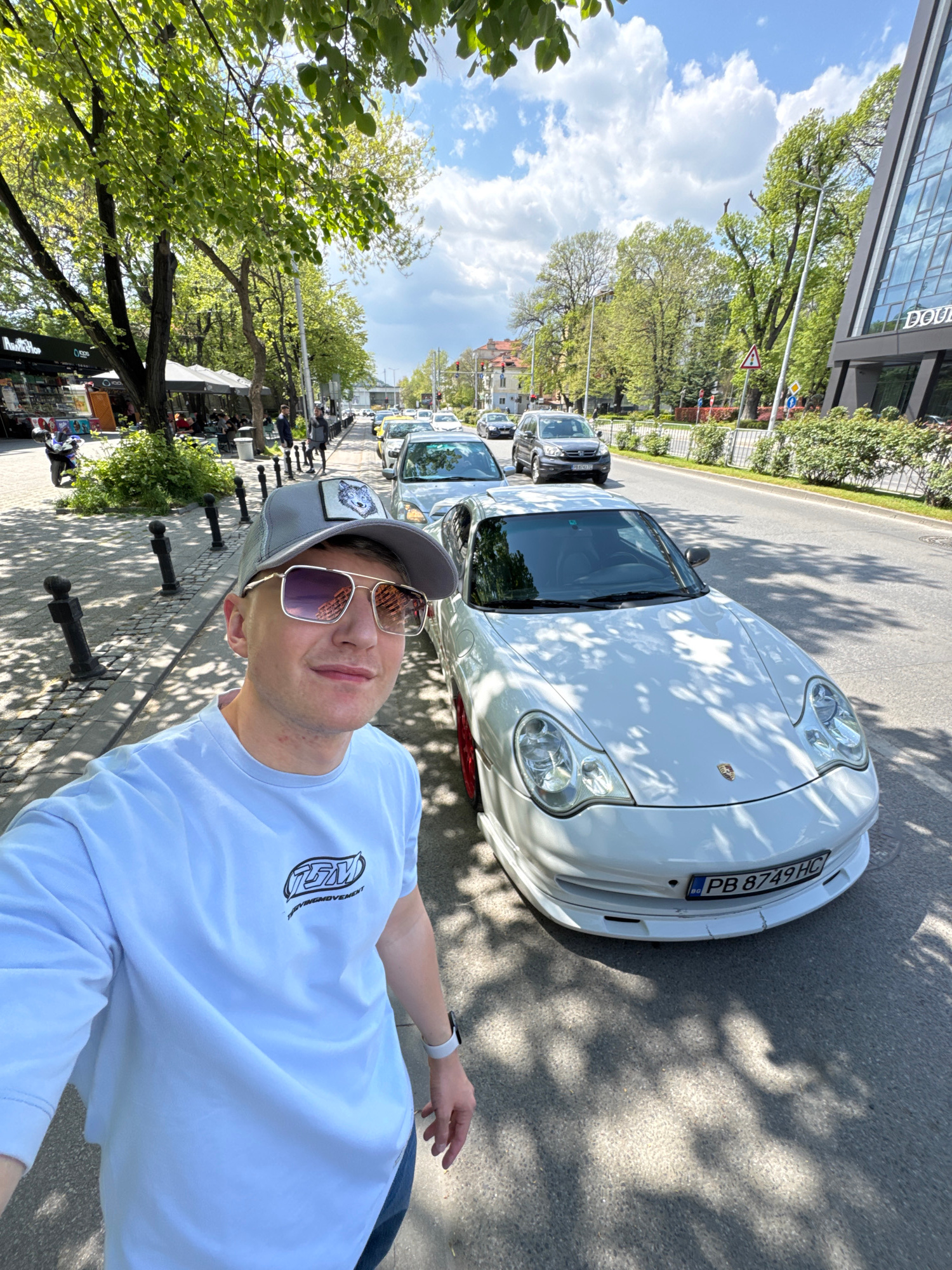 A man takes a selfie on a city street in Plovdiv, Bulgaria, next to a white Porsche. The street is lined with trees, small black bollards, and cafes. The buildings are modern. The man wears a baseball…read more