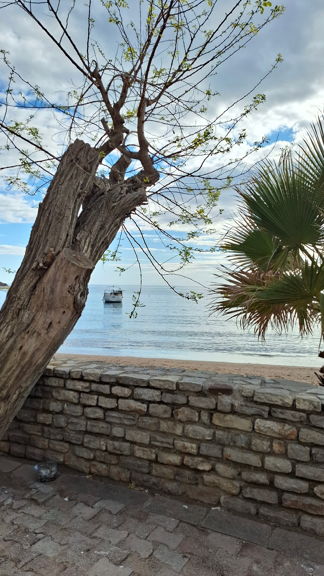 The image depicts a coastal scene in Boreti, Montenegro. In the foreground is a tree trunk with a few sparse branches against a partly cloudy sky. A palm tree's fronds partially obstruct the view towa…read more