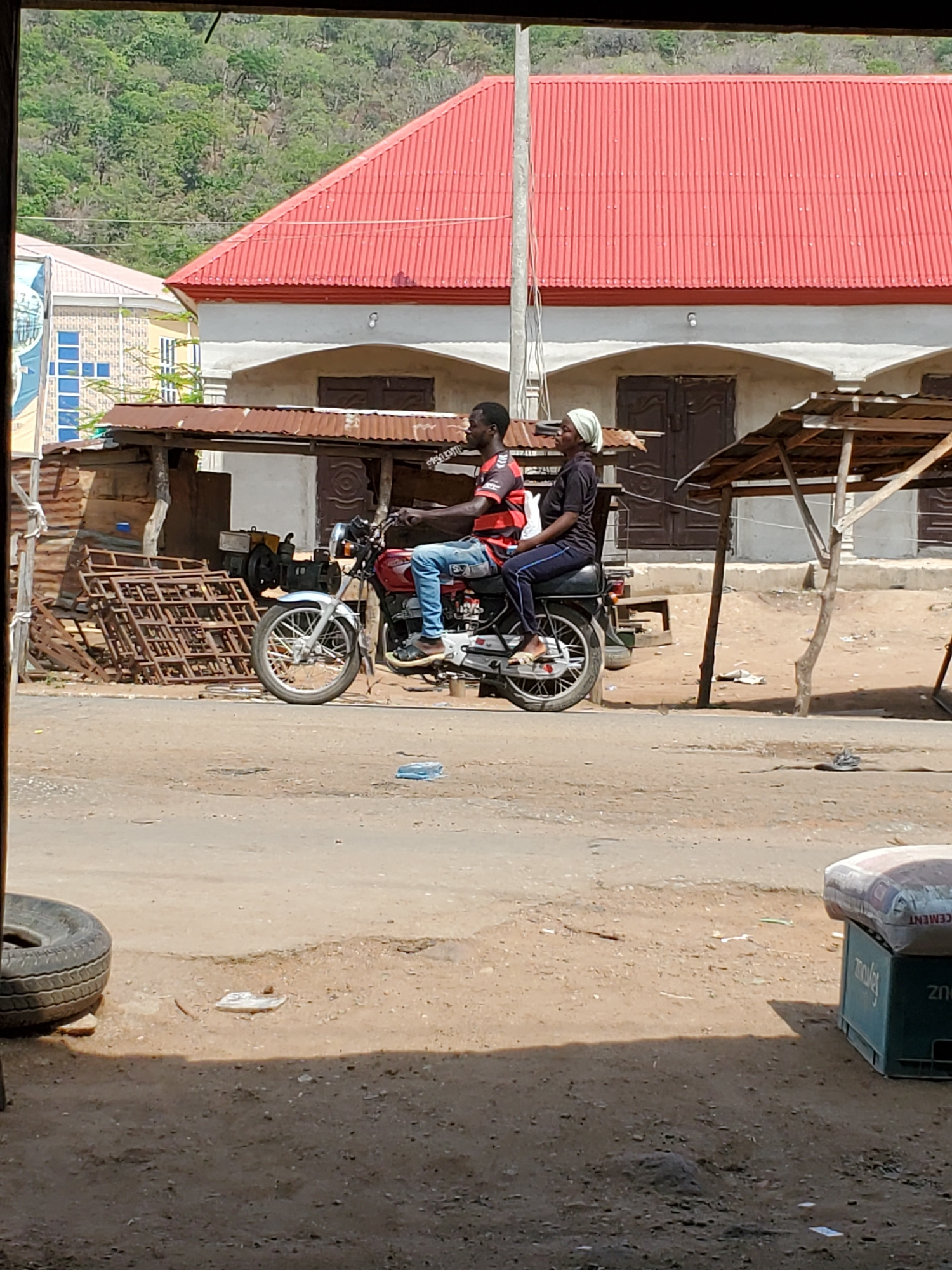 This outdoor scene, set in Mararaba, Nigeria, captures two men interacting with a motorcycle on a bright, sunny day. The image is taken on a dirt road, with shadows suggesting mid-morning or afternoon…read more