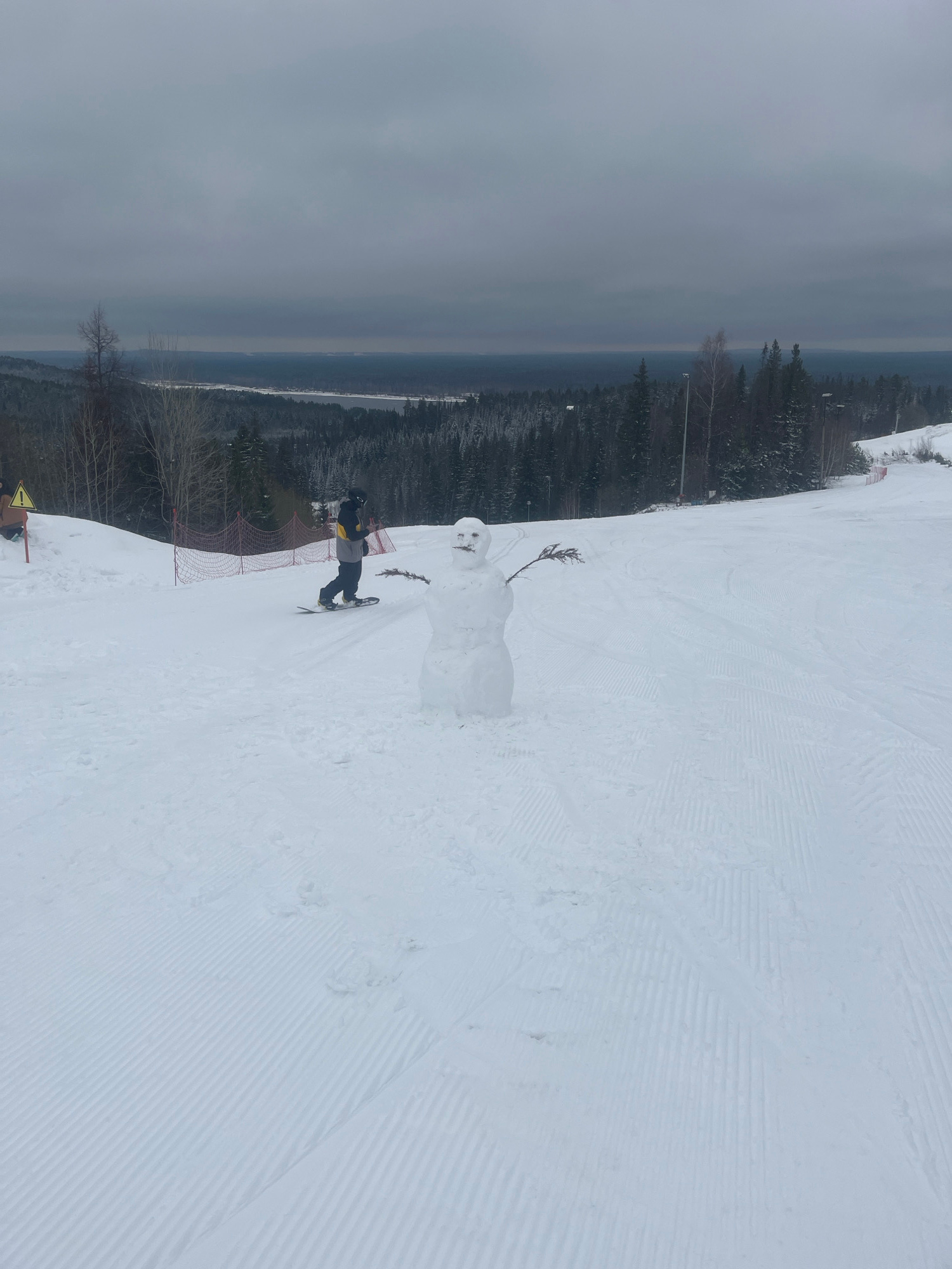 A snowboarder, wearing a black helmet and dark clothing with yellow accents, is riding down a snow-covered ski slope at the Nechkino Ski Resort. A snowman with stick arms stands on the right side of t…read more