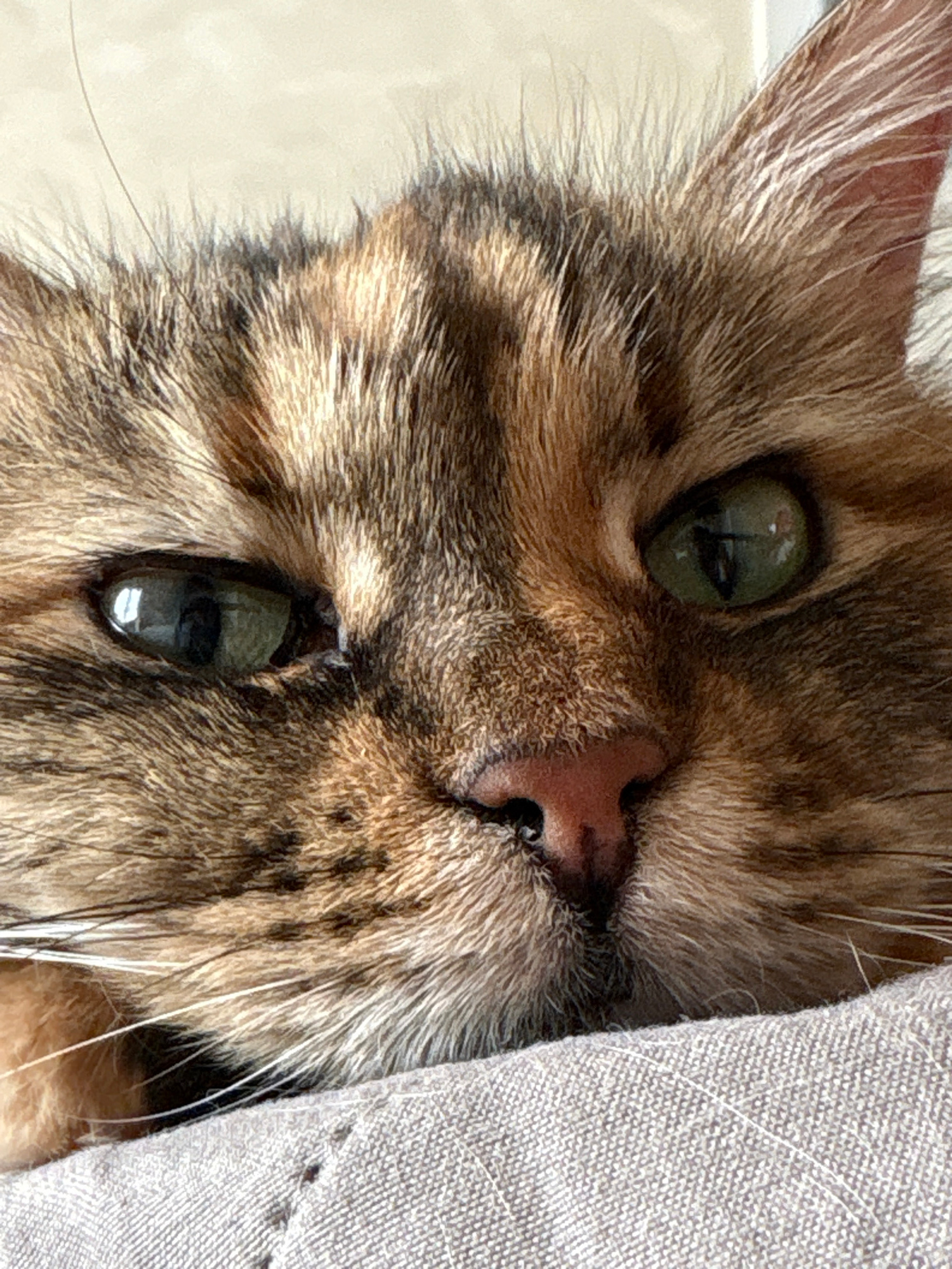 A close-up shot of a cat's face, featuring brown and tan fur, green eyes, and a pink nose. Part of the cat's face is against a gray fabric. The background to the left is a blurry off-white. The image…read more