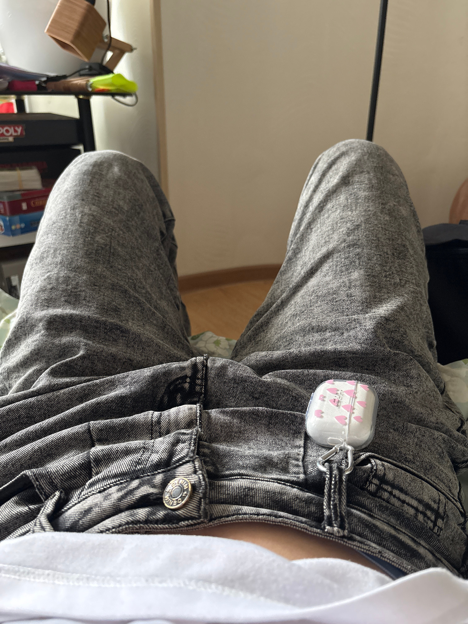 A person is seated, wearing acid-wash jeans. An AirPods case with a pink heart design is clipped to the belt loop. The location is not determined.