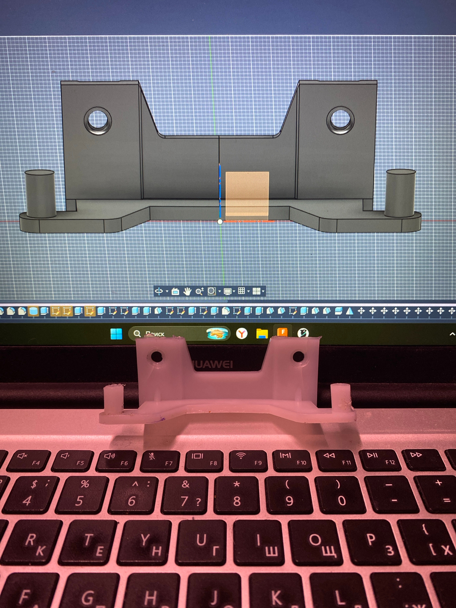 The image shows a comparison between a 3D computer model of a part and a physical 3D printed part placed on a laptop keyboard. The 3D model, rendered in gray, is displayed on a screen with a grid back…read more