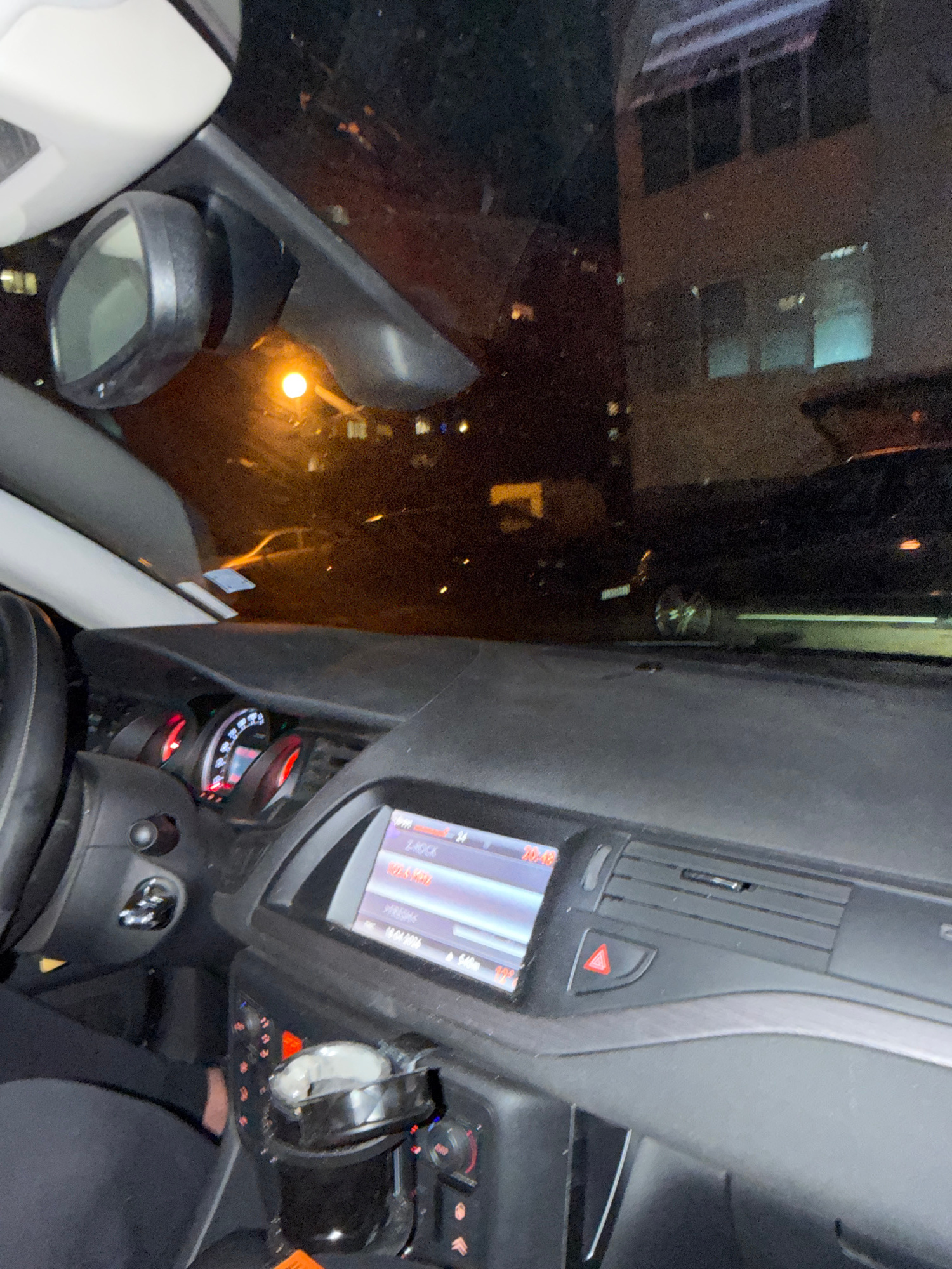 The image depicts the interior of a car, likely taken at night, with a view through the driver's side window. The car's dashboard is visible, including the infotainment screen, climate control vents,…read more