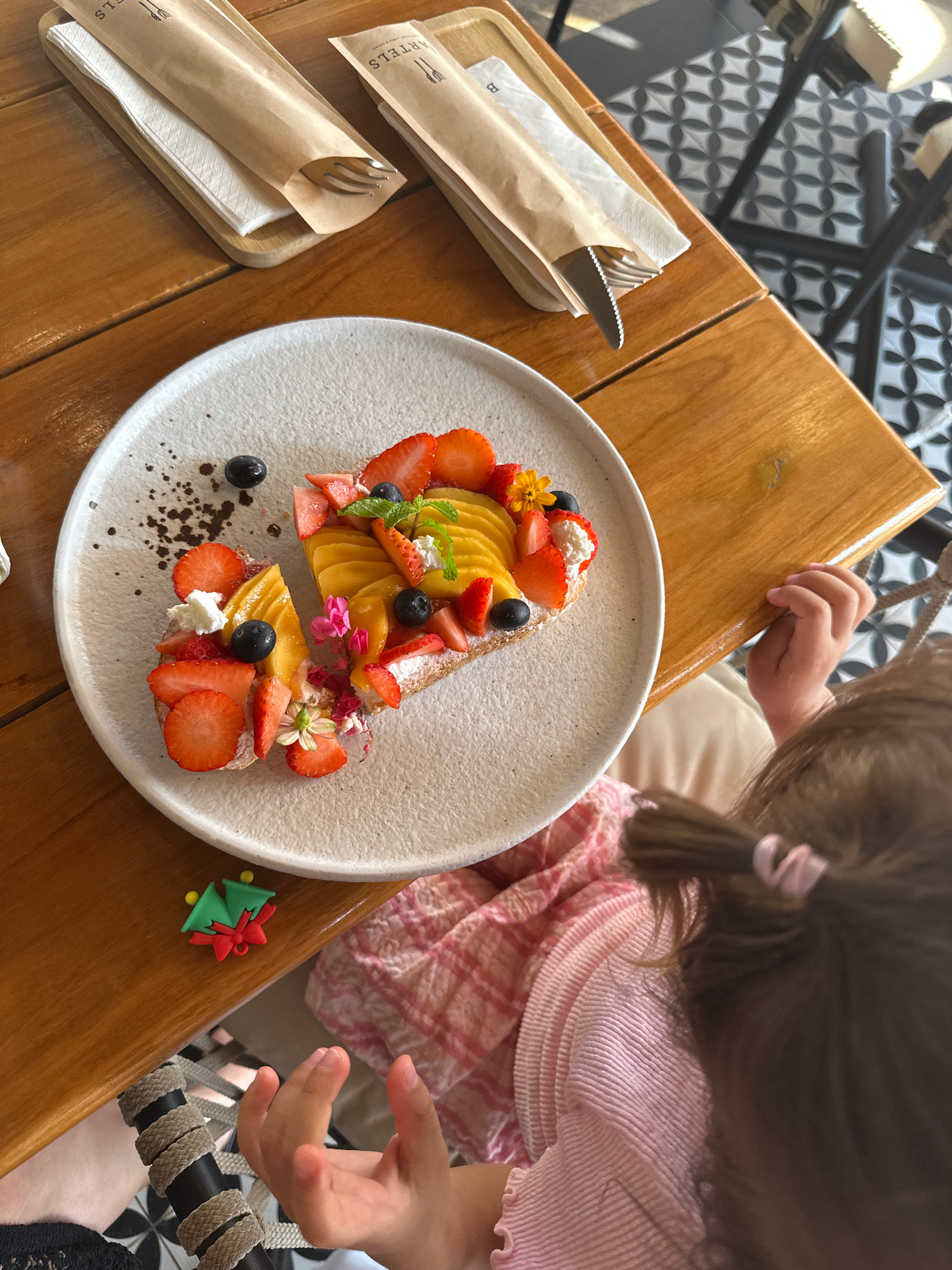 A high-angle shot shows a child sitting at a wooden table in what appears to be a dining establishment, possibly in Choeng Thale, Thailand. The table has two disposable cutlery sets in paper sleeves l…read more