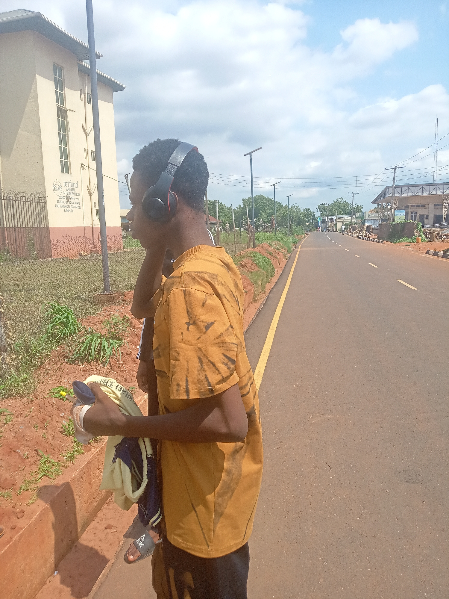 An outdoor, eye-level shot captures a young person standing by the side of a paved road in Nsugbe, Nigeria, likely during the daytime. The subject, facing left with a slight profile, wears a yellow/or…read more