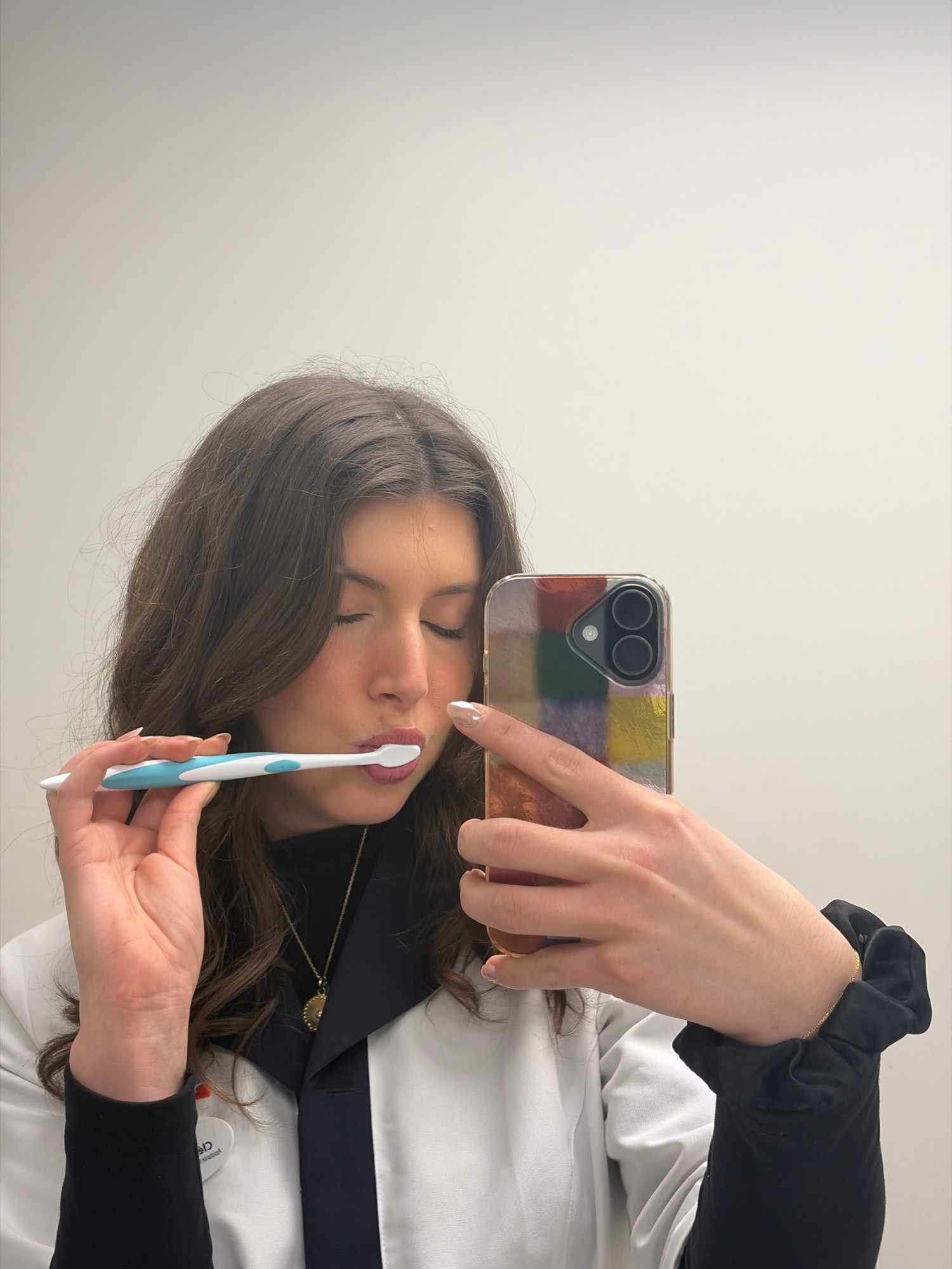 A young woman is holding a toothbrush to her lips while taking a selfie in front of a plain white wall. She is wearing a white medical-style jacket with black accents and a black undershirt, and a nec…read more