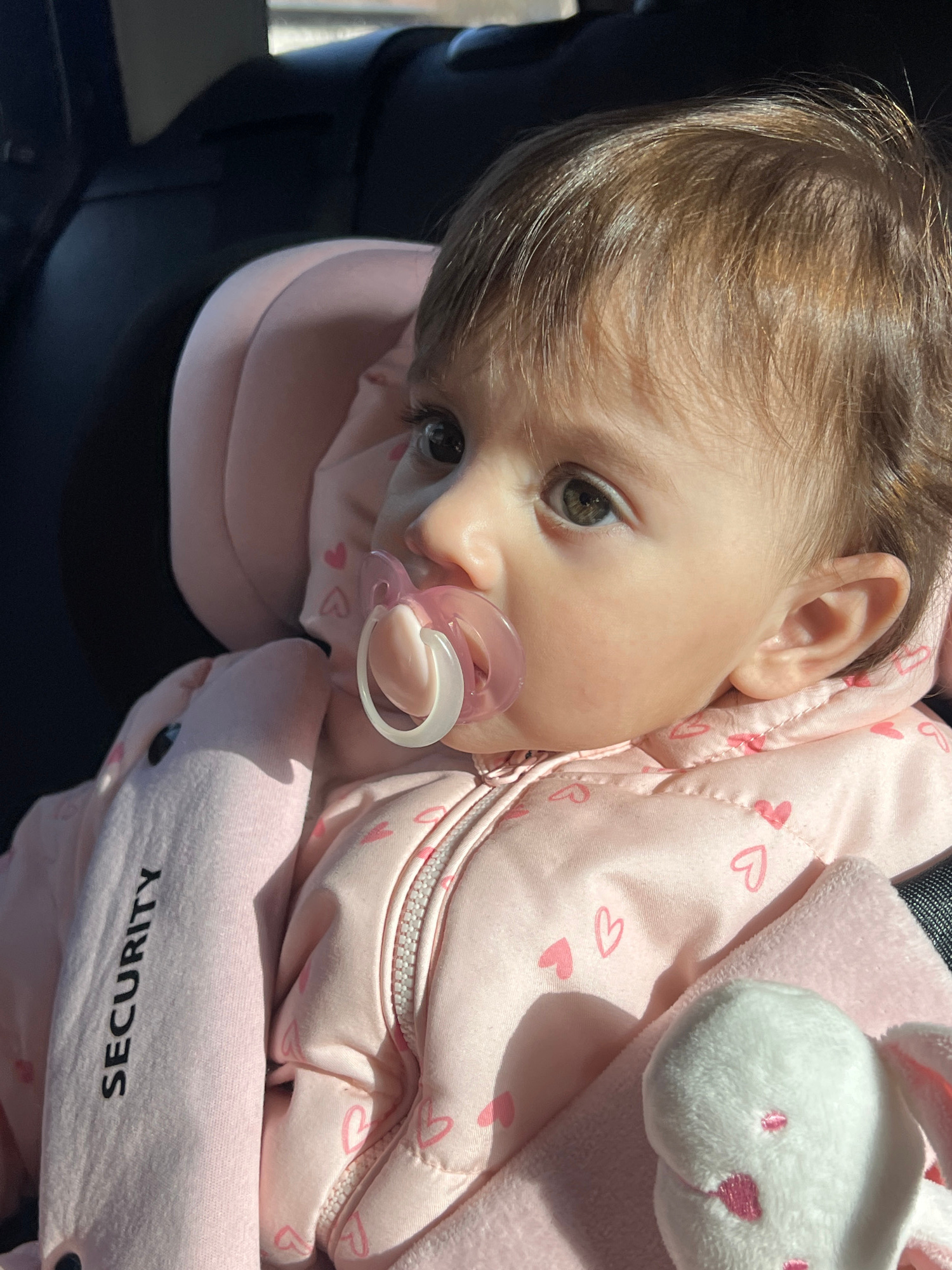 A close-up shows a baby lying in a car seat. The baby has light brown hair, fair skin, and brown eyes. The baby is wearing a pink jacket with small heart patterns and has a pacifier in its mouth. Next…read more