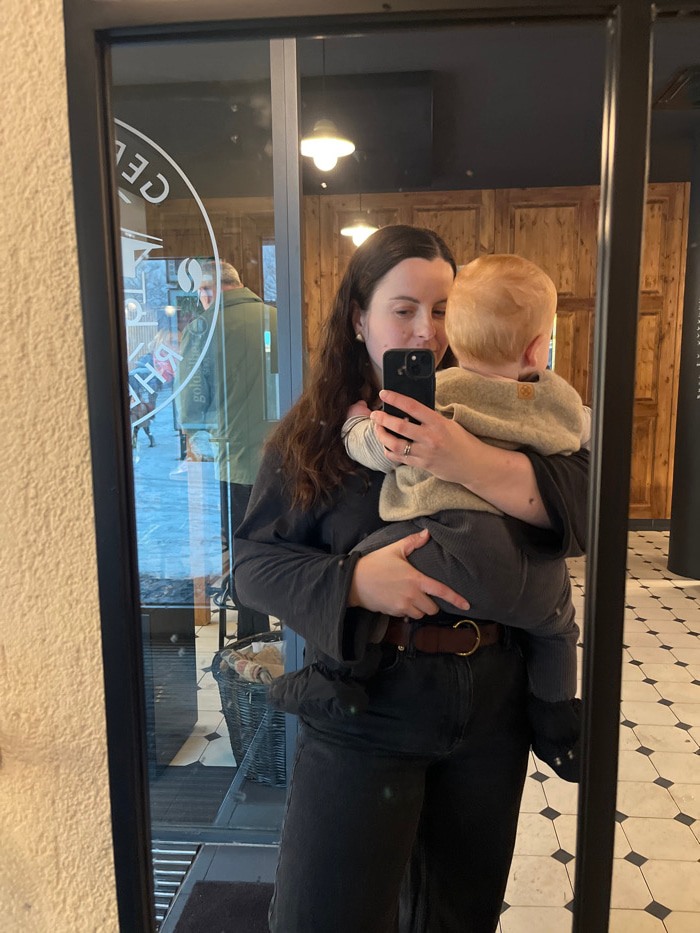 The image captures a mirror selfie of a woman holding a baby inside a coffee shop. The woman, positioned centrally, has long dark hair, wears a dark long-sleeved top, dark jeans, and a brown belt with…read more