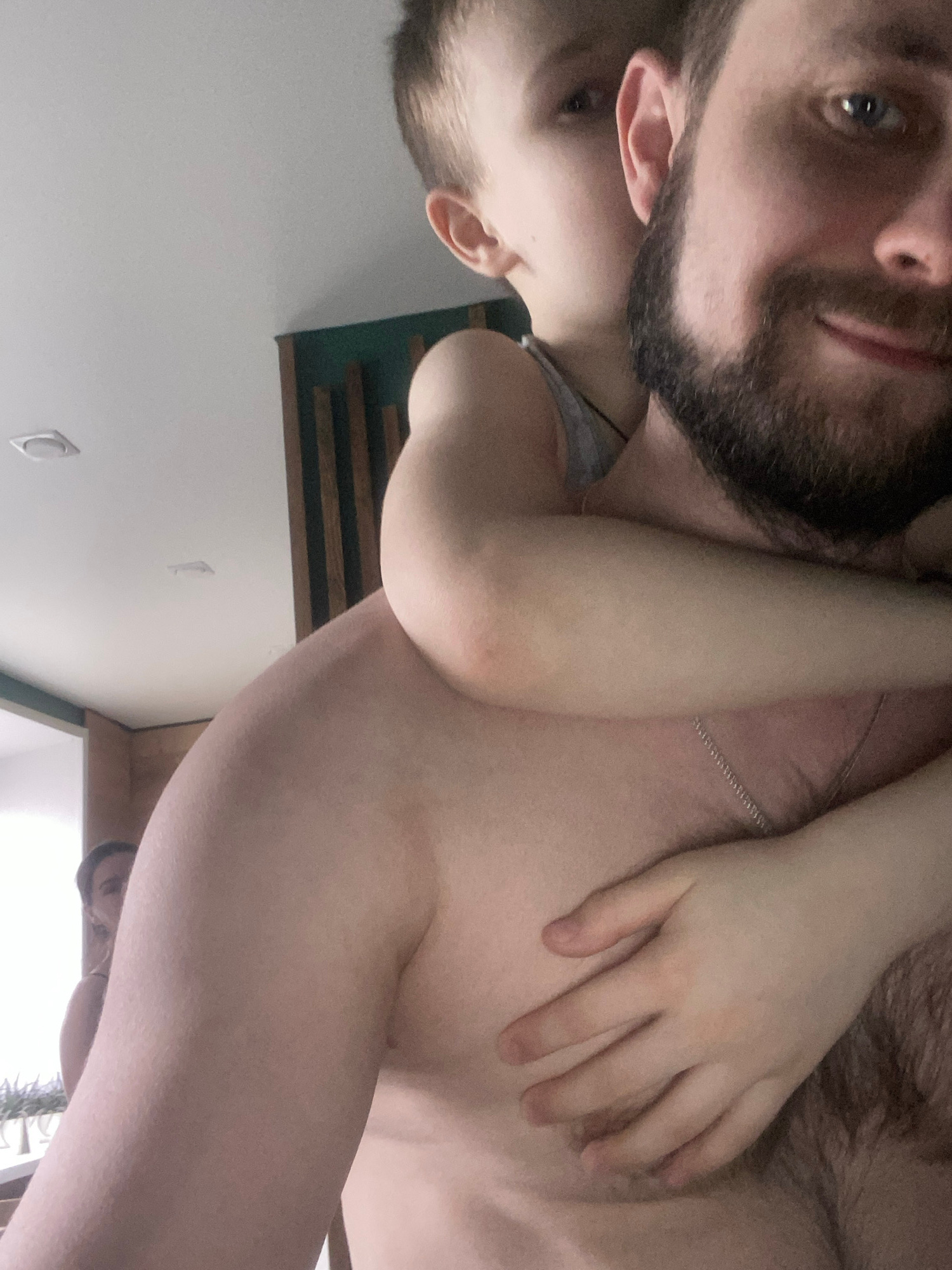 A man with a beard is lying down, holding a child. The man is facing the camera, and the child's head is near his ear. The child's hand is on the man's chest. A silver chain is around the man's neck.…read more