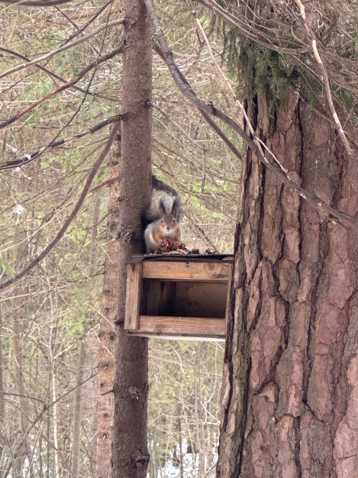 A squirrel is positioned on a tree branch directly adjacent to a small, wooden birdhouse. The birdhouse is rectangular with a single opening. Above the branch and birdhouse is the underside of a large…read more