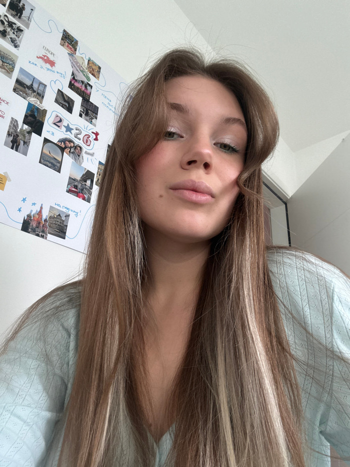 A young female, appearing to be between 18 and 25 years old, is depicted indoors in the city of Vozdovac Urban Municipality, Serbia. She has long, straight to slightly wavy brown hair with blonde high…read more