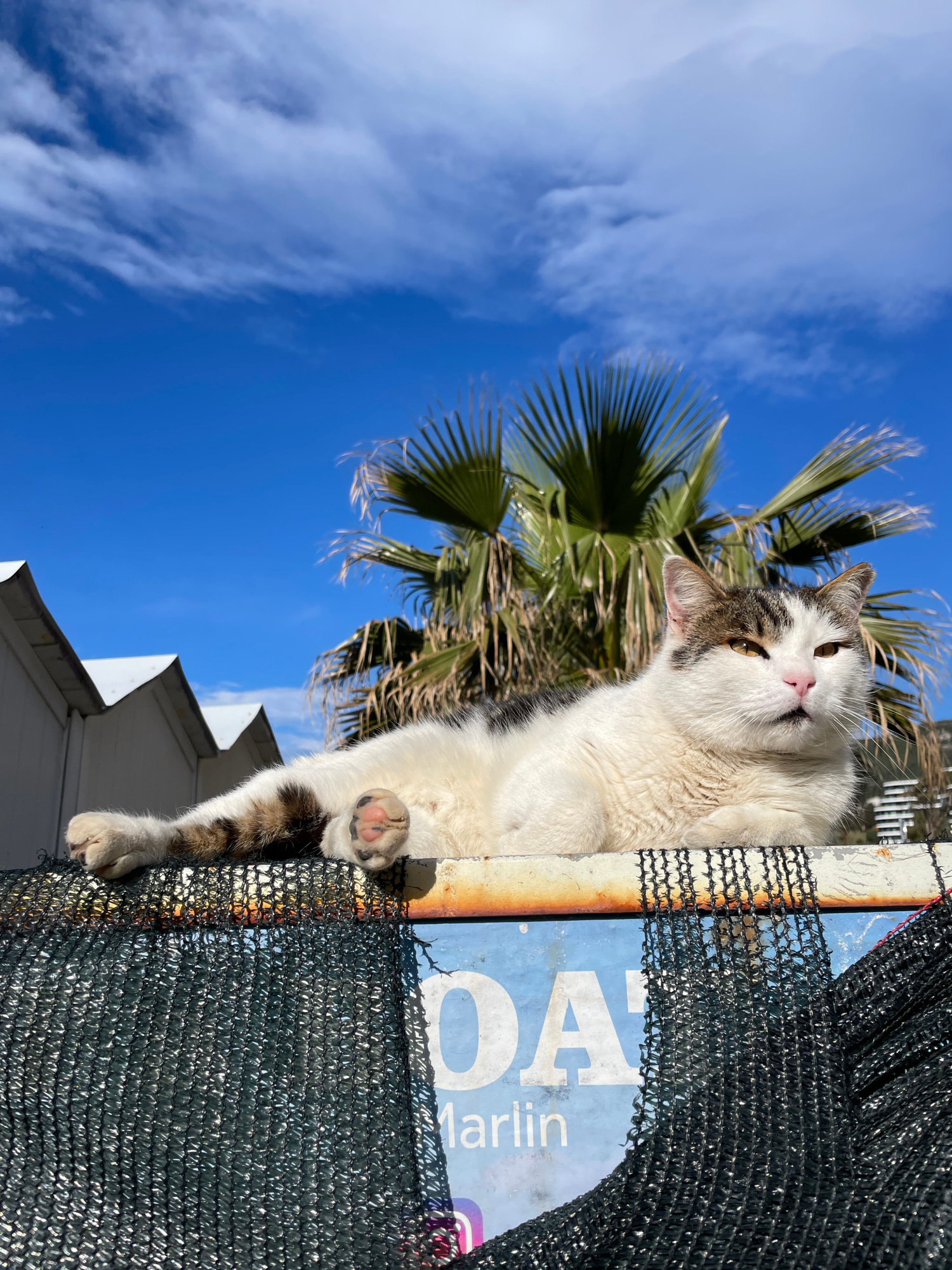A low-angle shot reveals a white and grey tabby cat perched on a blue sign that reads "Marlin" in Rafailovići, Montenegro. The cat is resting on a structure covered with black netting. Behind the cat,…read more