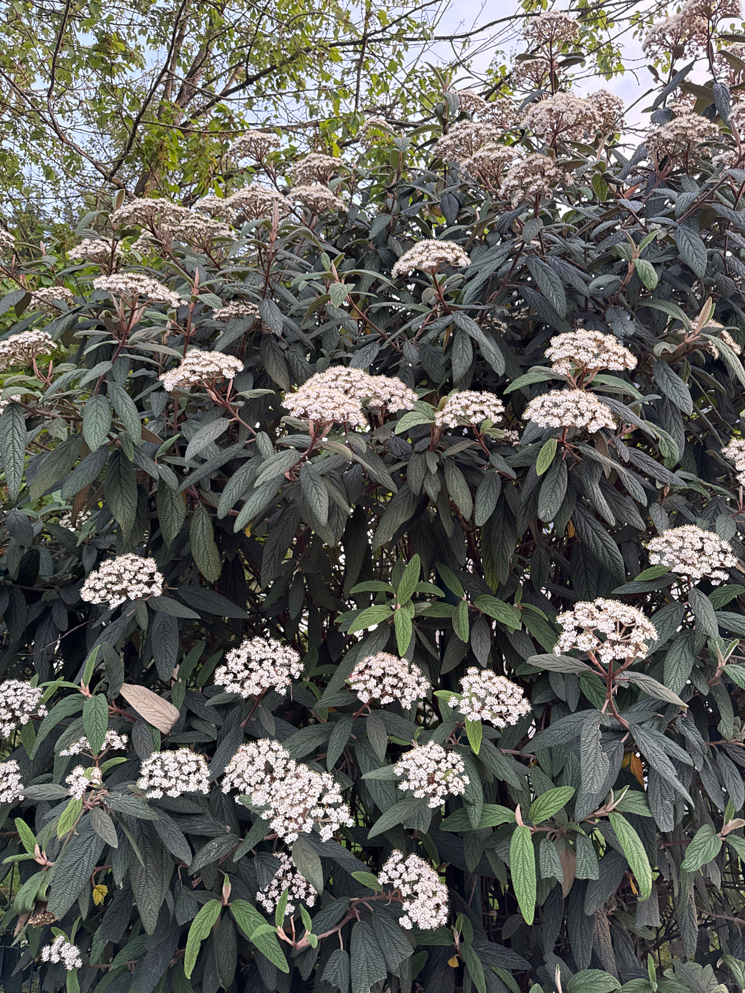 A close-up, medium-angle photograph shows a flowering shrub, likely located outdoors. The shrub features dark green leaves with prominent veins and clusters of small, white flowers. The flowering exte…read more