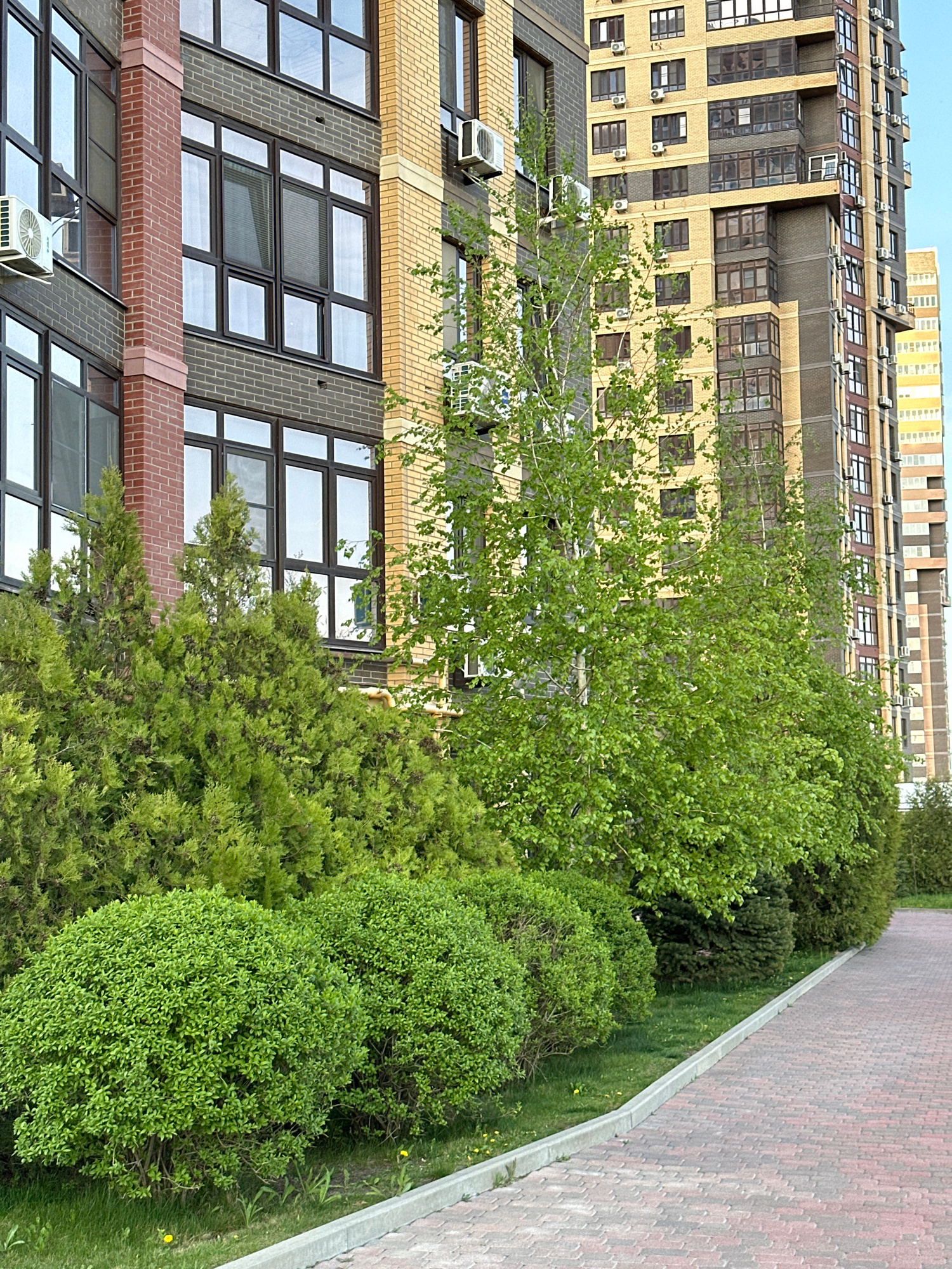 The image depicts a multi-story building with a facade composed of different materials, including brick and what appears to be stucco or concrete. Many windows and air conditioning units are visible o…read more