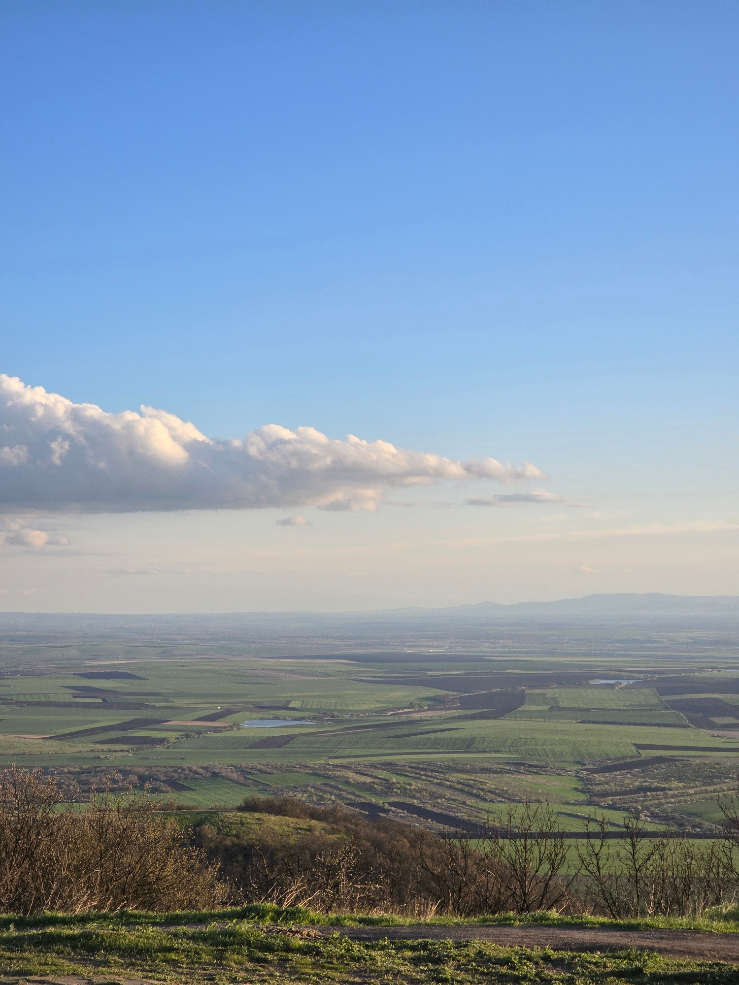 The image depicts a landscape near Pobeda, Bulgaria. The sky is predominantly blue with some white clouds. The foreground shows green fields and vegetation, with a dirt road running along the edge. So…read more