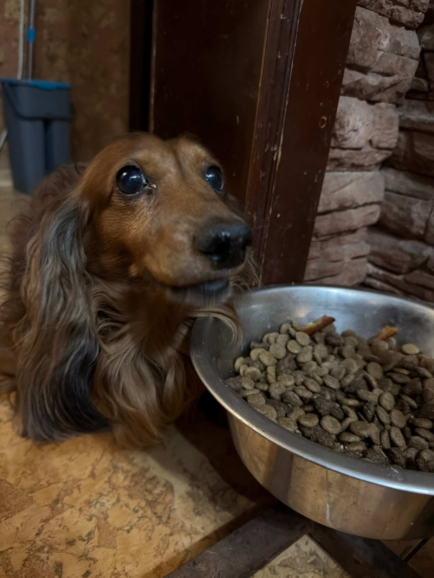 A long-haired dachshund sits beside a metal bowl filled with dog food. The bowl is positioned above the dog, possibly on a surface. The background includes a wall with what appears to be a stone or br…read more