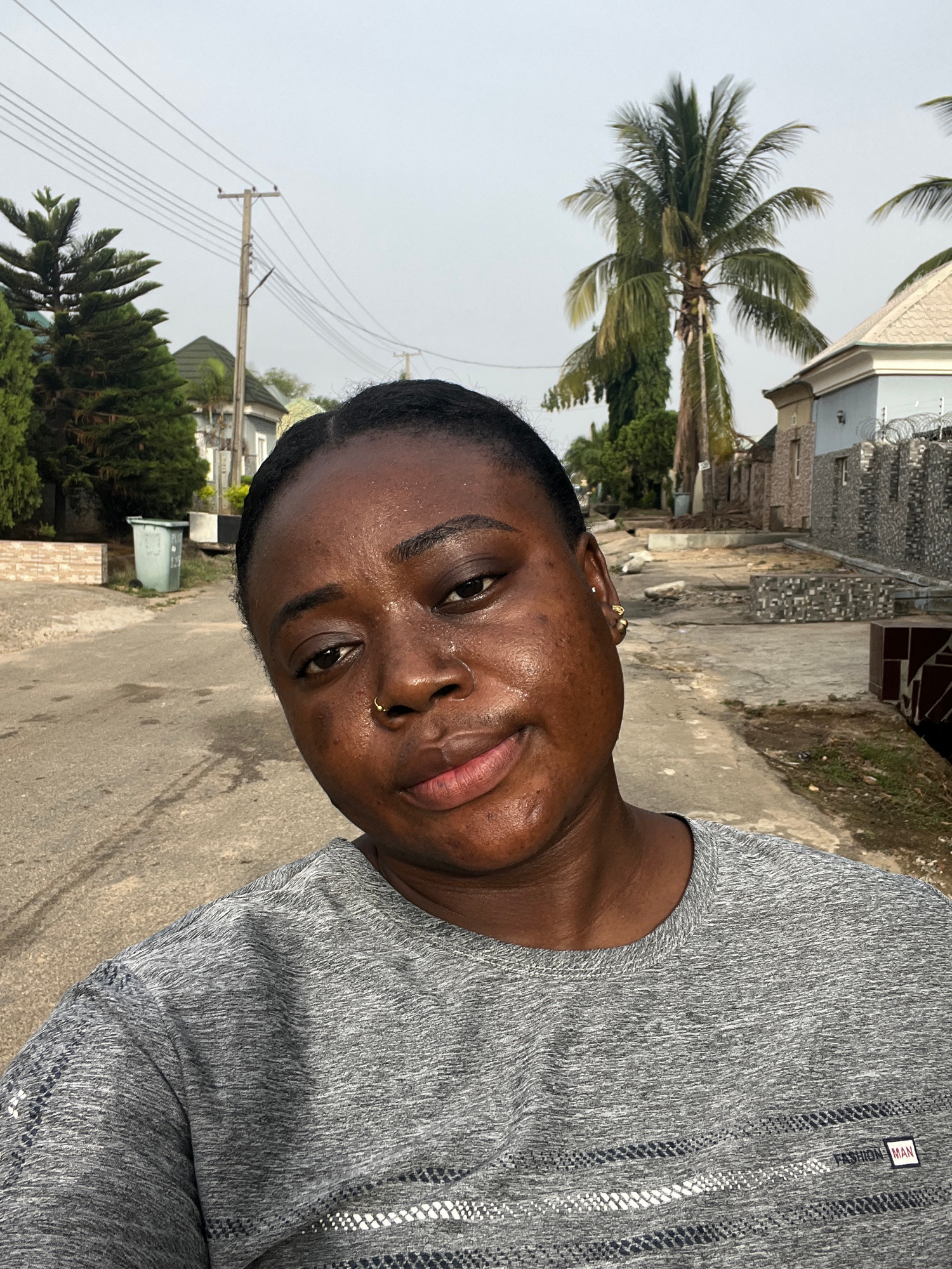 A woman with dark skin and short hair stands on a paved road, likely in a residential area in Abuja, Nigeria. She is wearing a grey t-shirt and has a nose ring. A palm tree and other trees are visible…read more