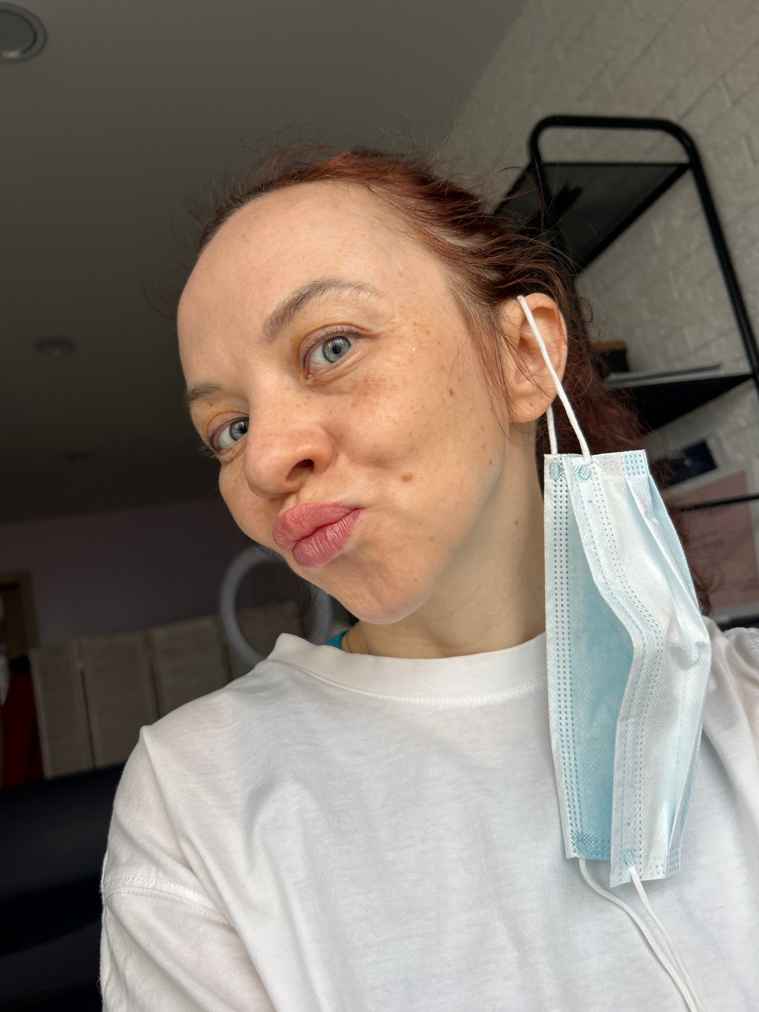 An indoor portrait features a woman with reddish-brown hair, light blue eyes, and fair skin with visible freckles. She is wearing a white short-sleeved t-shirt. The image is rotated 90 degrees clockwi…read more