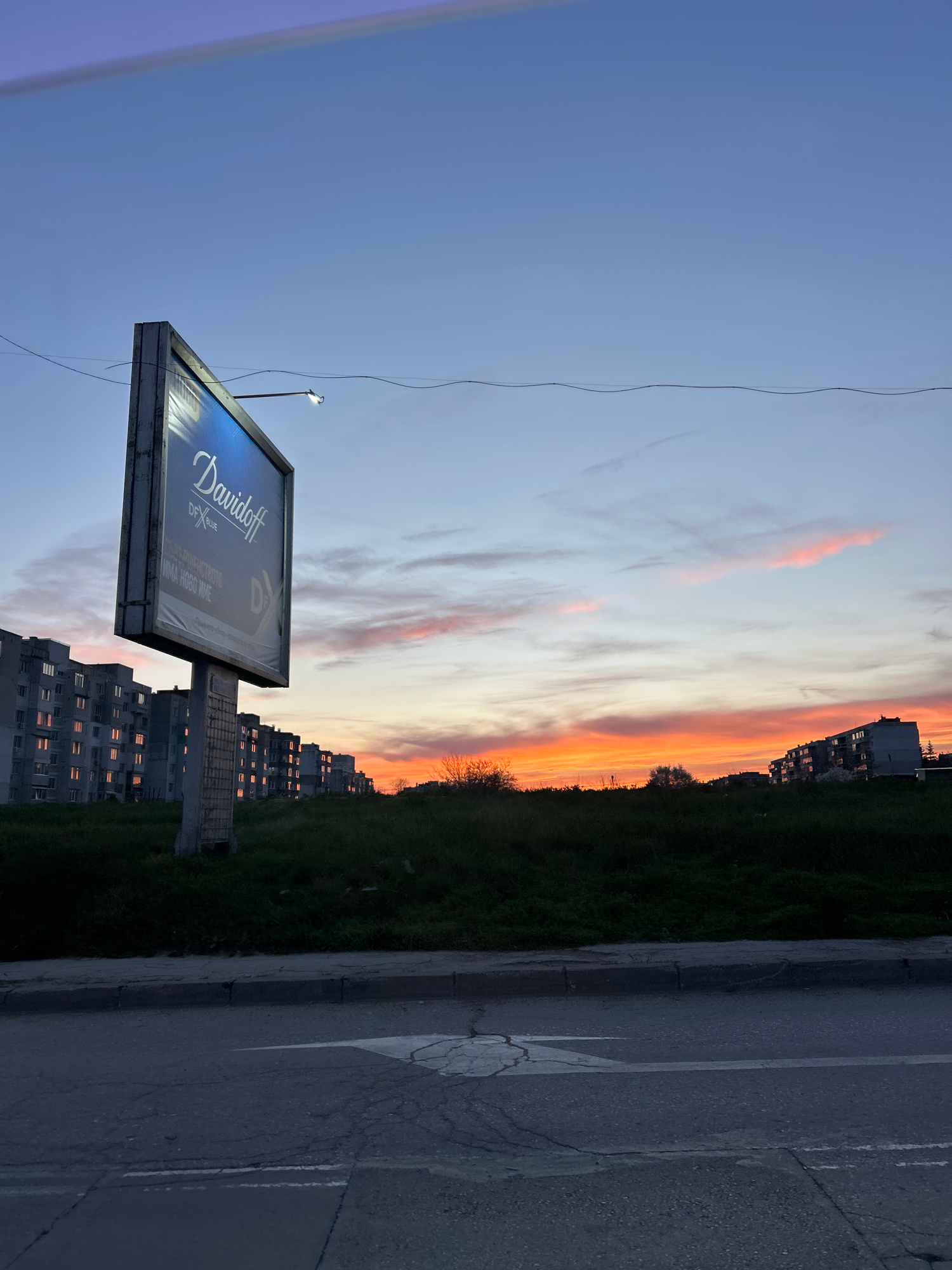 The image captures a street scene in Varna, Bulgaria, during a vibrant sunset. The sky transitions from blue to orange and pink hues. A billboard for Davidoff cigarettes stands prominently, illuminate…read more