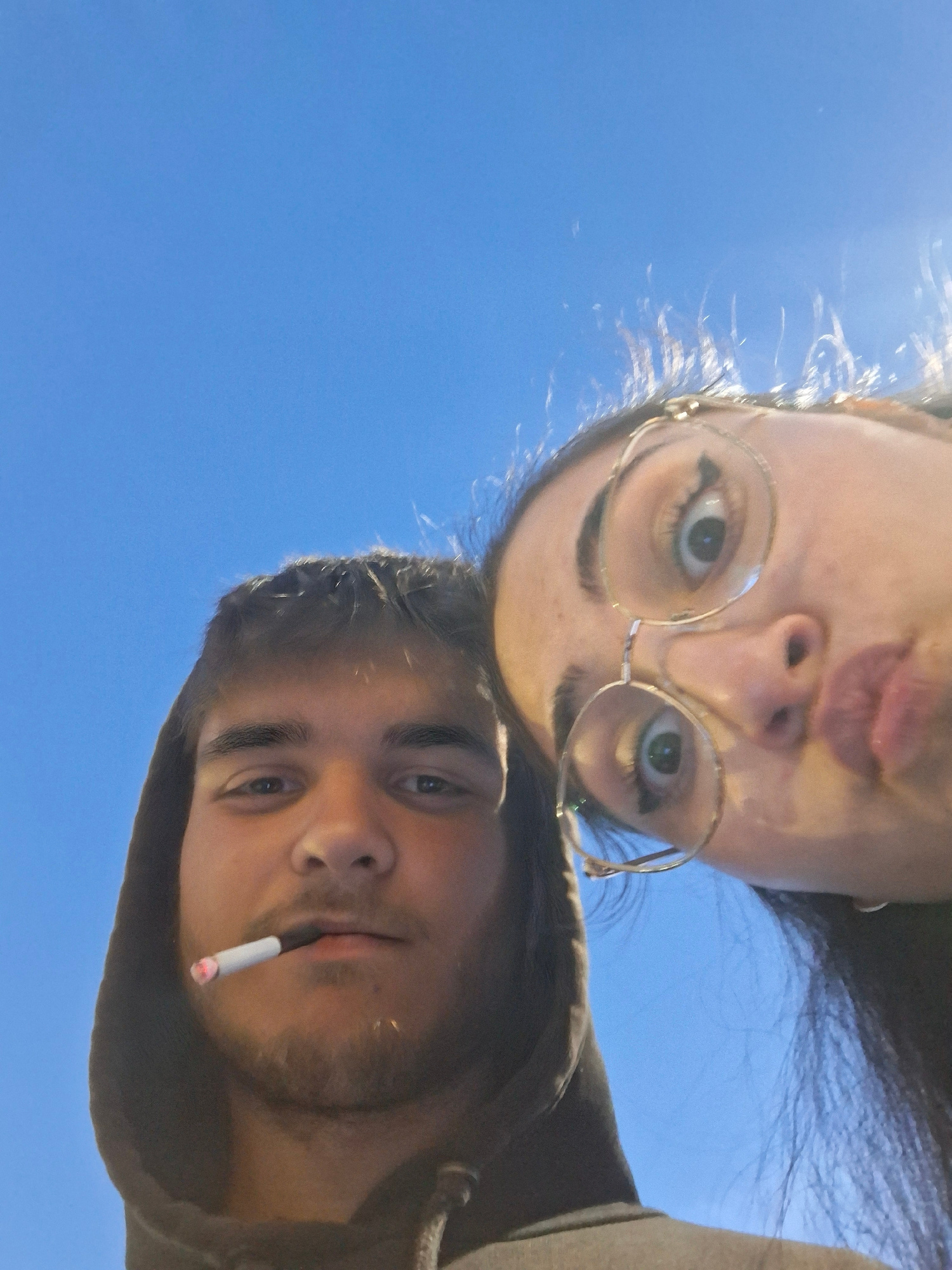Two individuals are captured from a low-angle perspective against a bright blue sky. The upper individual is a fair-skinned person with dark hair and glasses, pursing their lips. The lower individual…read more