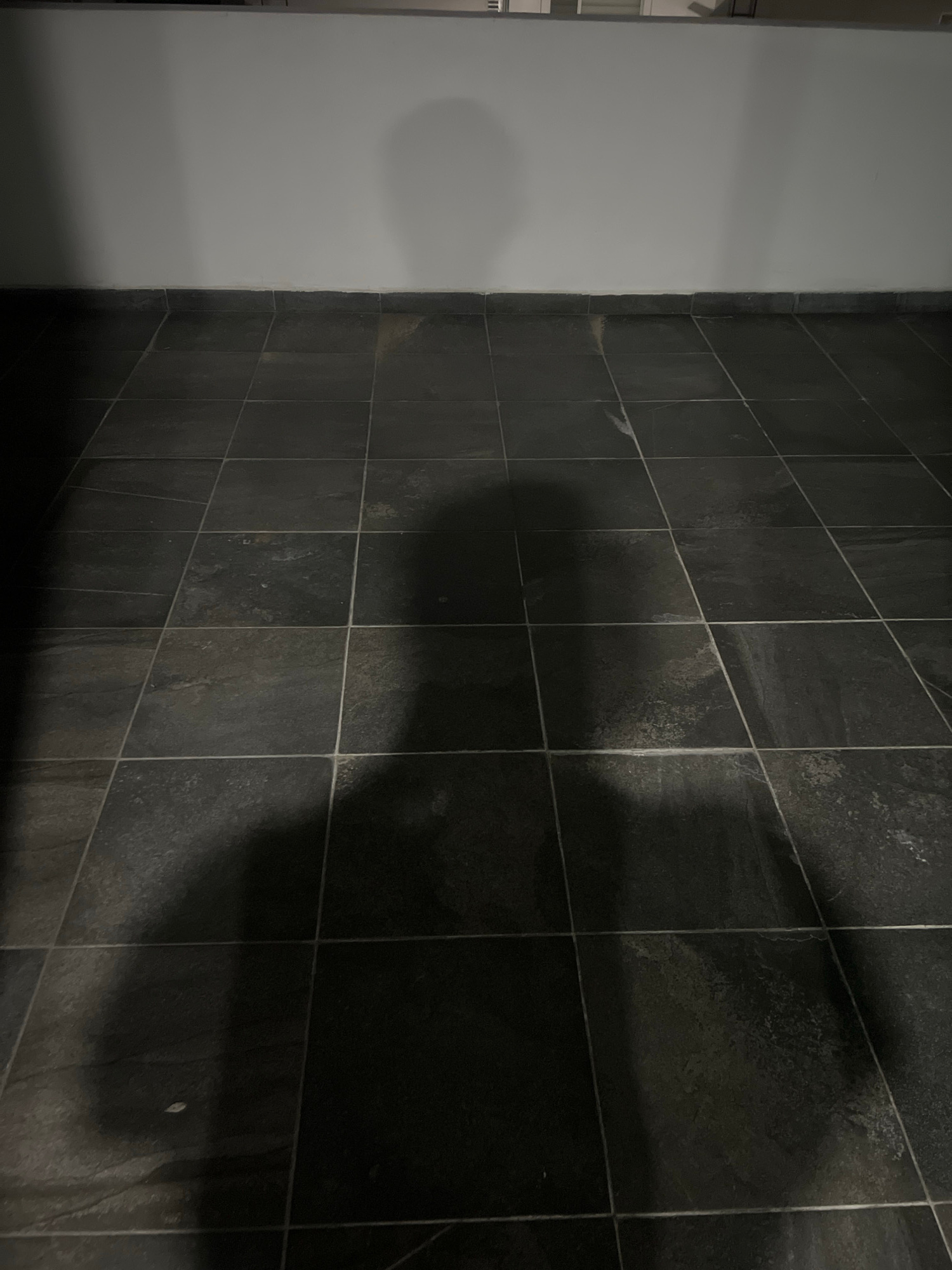 The image displays an indoor scene featuring two walls meeting at a corner. The wall on the left is painted a light grey or off-white color and has a smooth texture. The wall on the right is covered i…read more