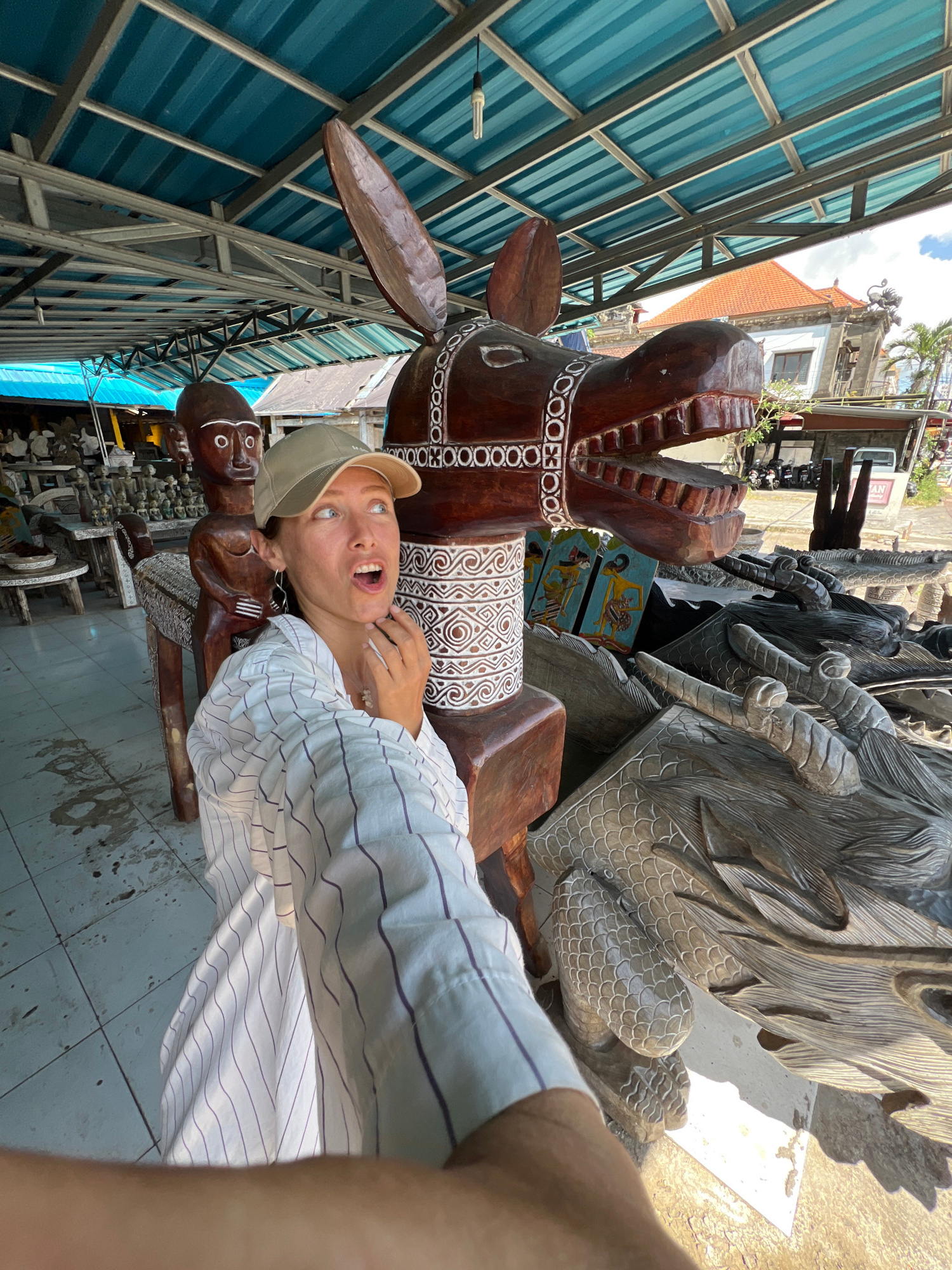 The image captures a woman posing with wooden carvings in Ubud District, Indonesia. The background features buildings and greenery typical of the region. In the foreground, a woman wearing a light-col…read more