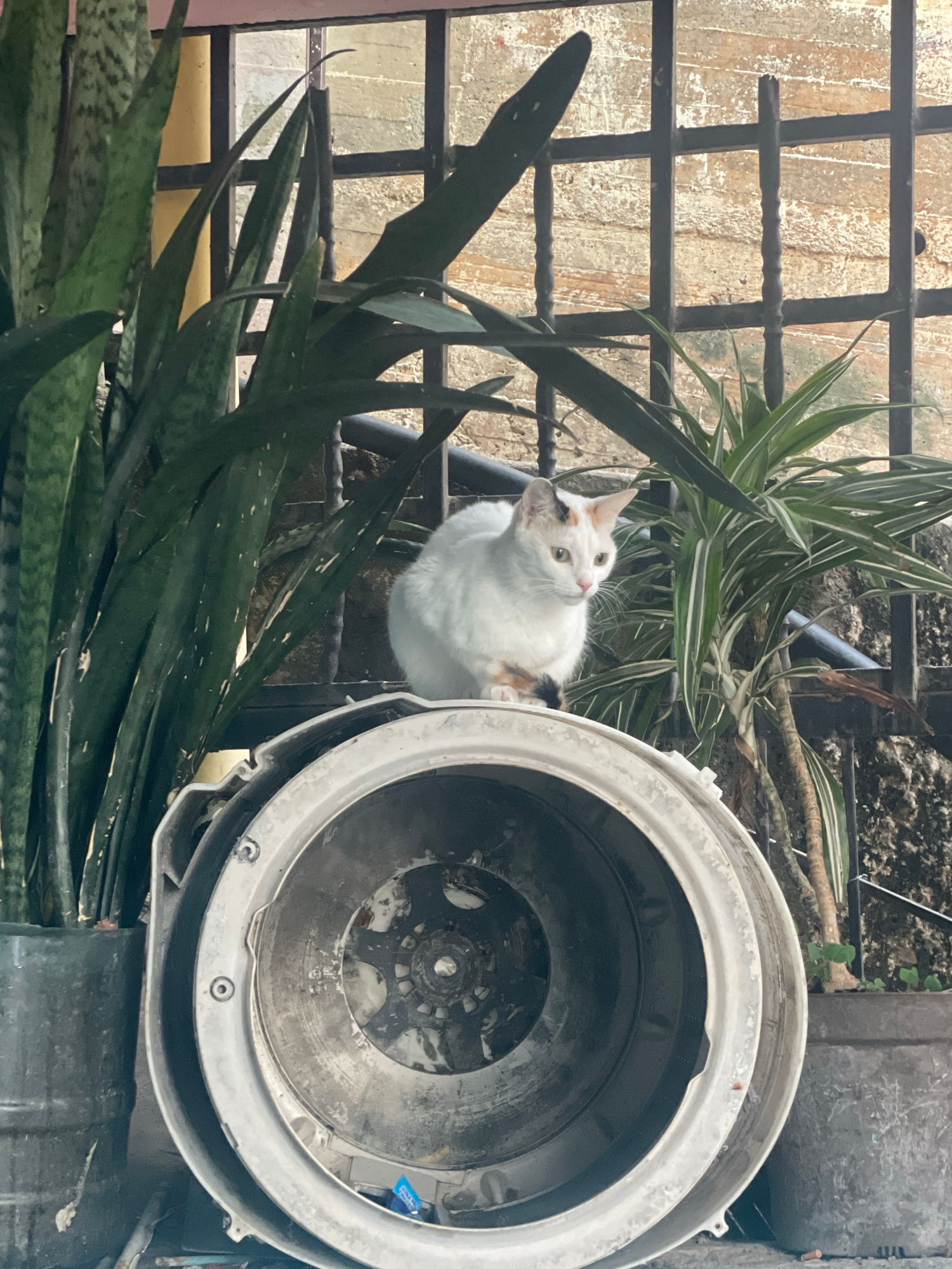 The scene depicts a domestic setting in Caracas, Venezuela, featuring a white calico cat positioned among potted plants and what appears to be a disassembled washing machine drum. The cat is looking u…read more