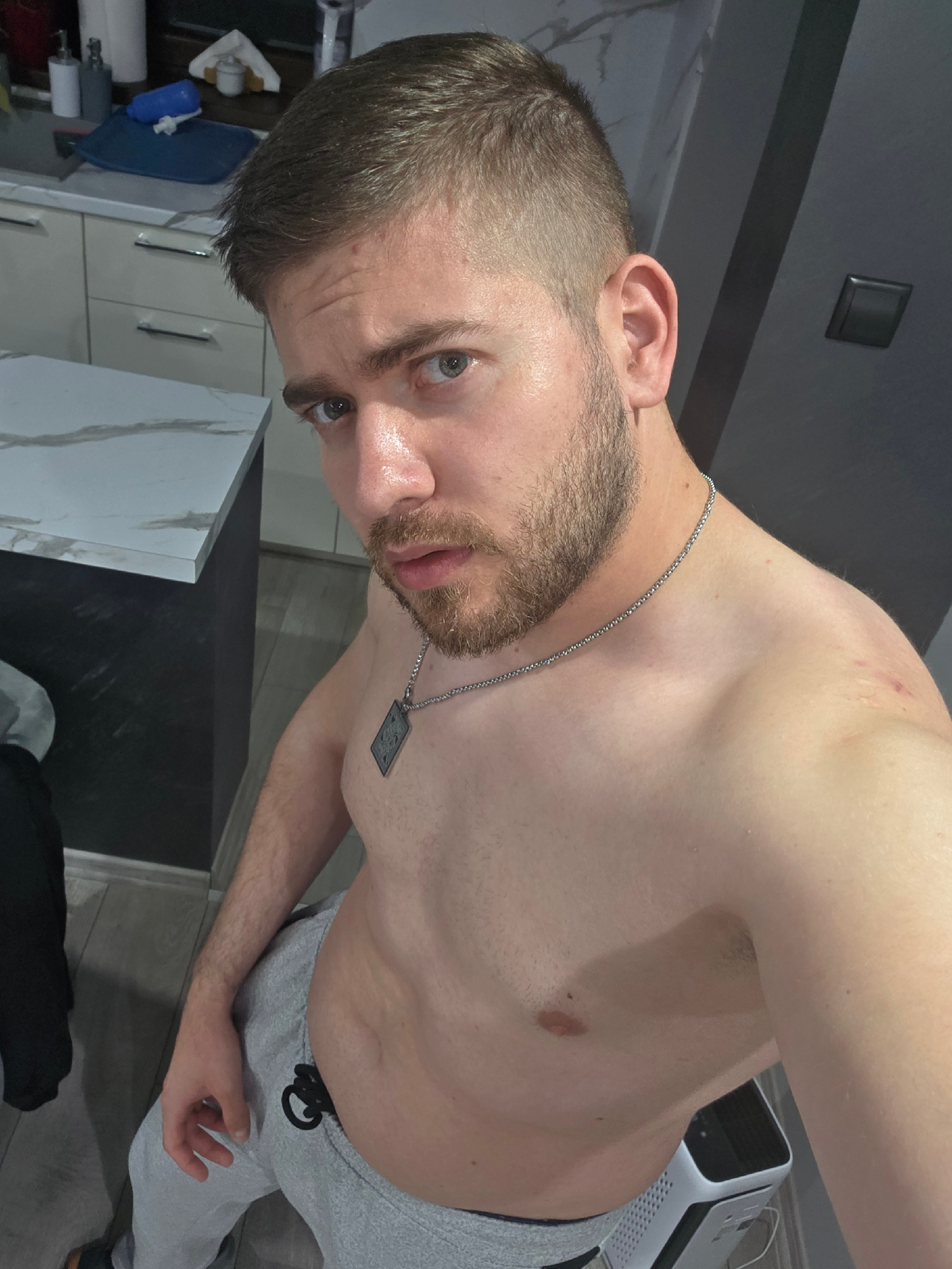 The image depicts a shirtless man with a beard and short brown hair wearing grey sweatpants and a silver chain necklace. He is indoors, with a countertop visible behind him, possibly in a kitchen or b…read more