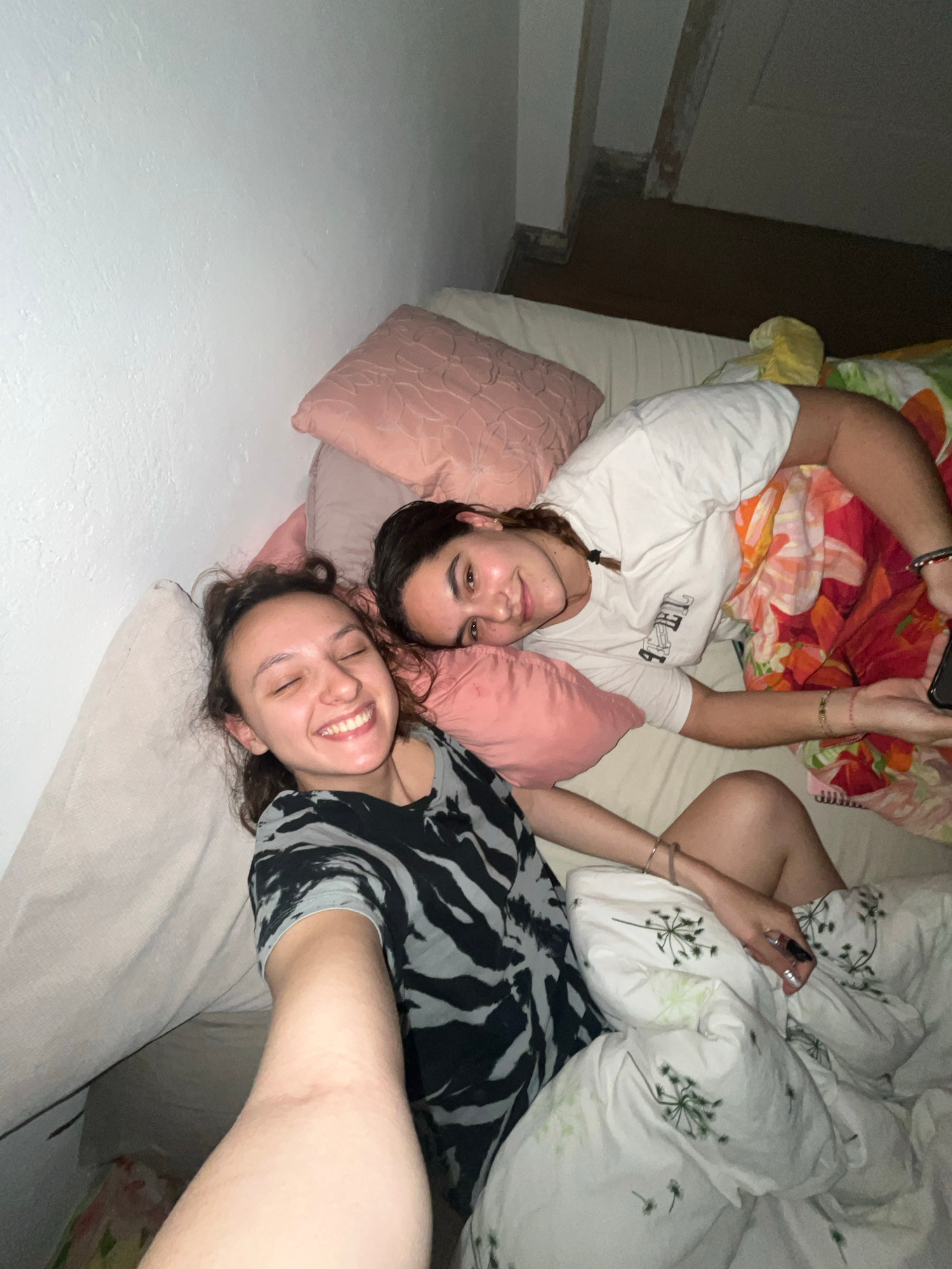 Two women are lying on a bed. One is wearing a white t-shirt and holding a phone. The other is wearing a black and white shirt. There are pillows and blankets on the bed. The location is unknown, and…read more