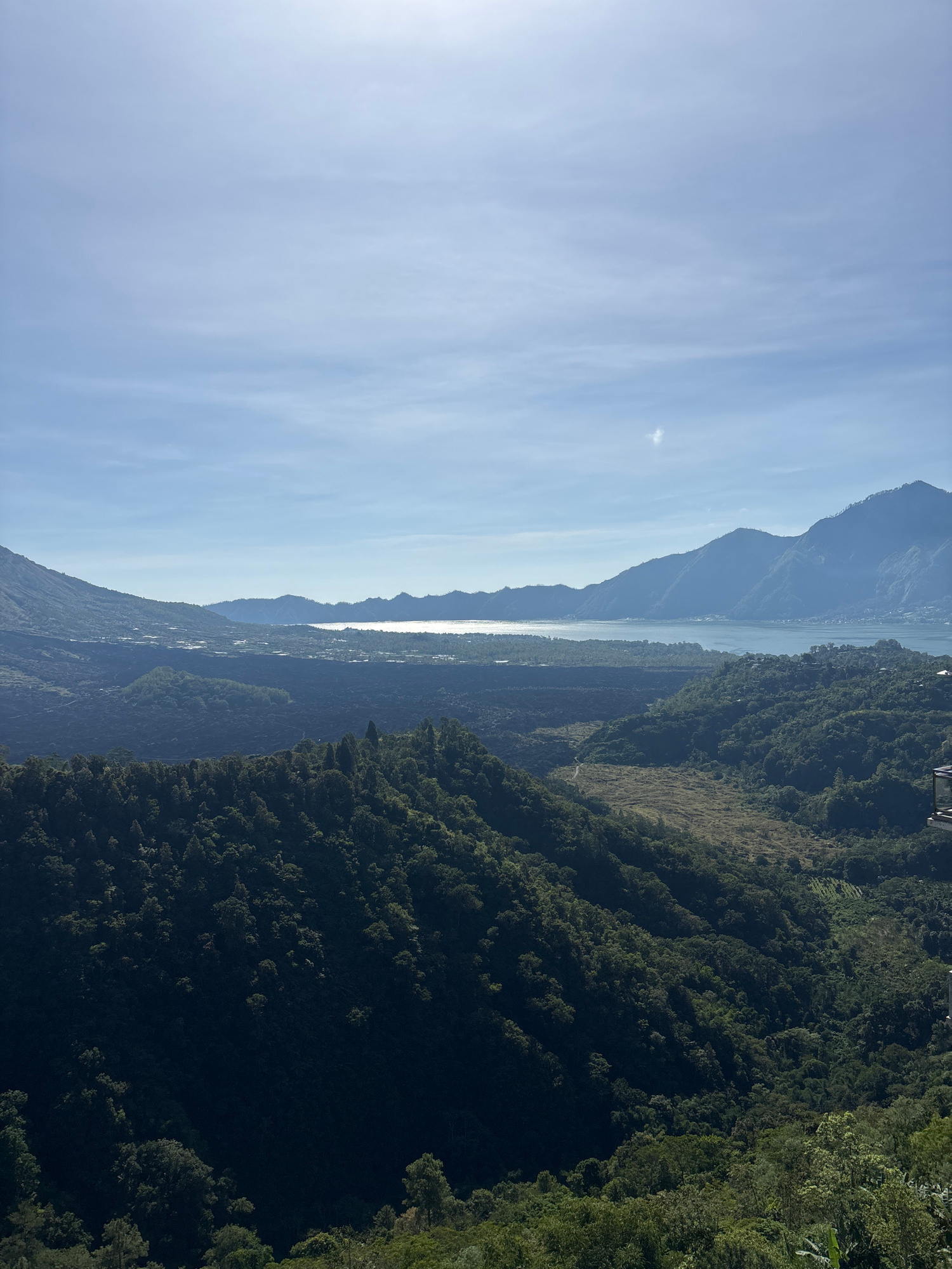 The image shows a landscape in Kintamani, Indonesia. The sky is a pale blue with soft, indistinct clouds. A range of mountains extends into the distance, with a reflective body of water between the mo…read more