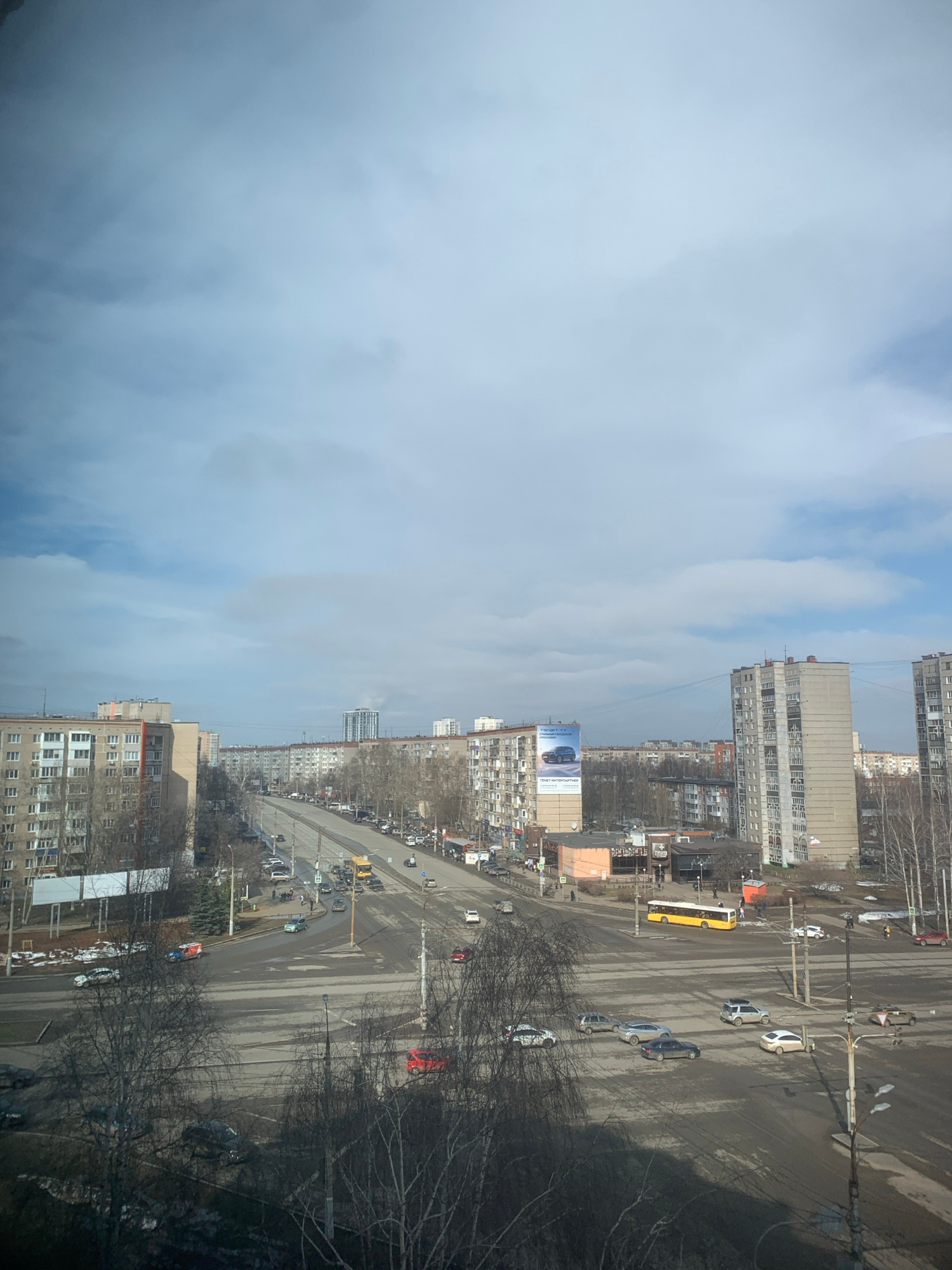 The image depicts a cityscape in Izhevsk, Russia, viewed from an elevated position. The right side of the image shows a busy road with multiple lanes of traffic, including cars and a yellow bus. Build…read more