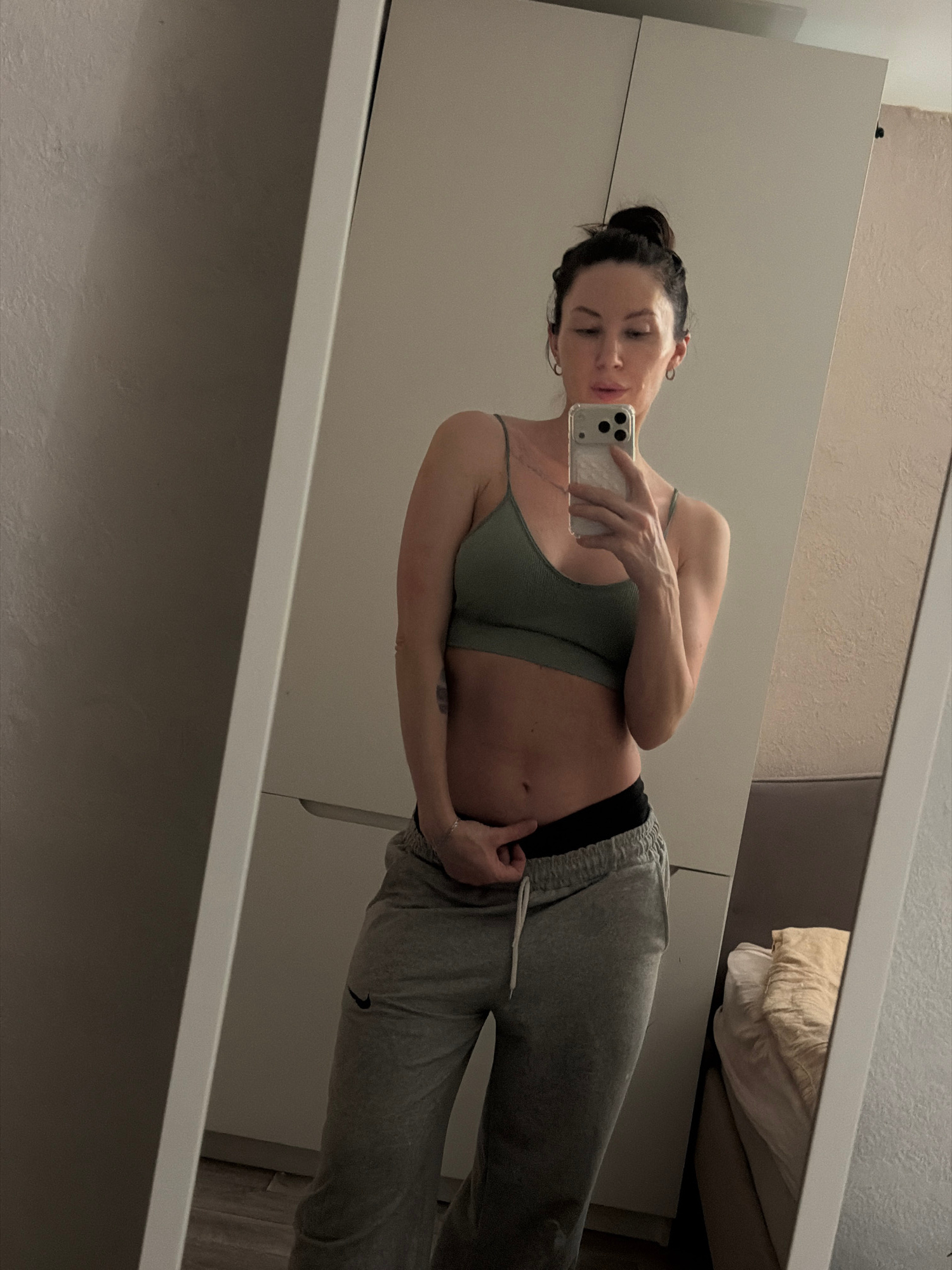 A woman is taking a mirror selfie indoors. She is wearing a light green sports bra and grey sweatpants. The background includes a white wardrobe and a glimpse of a bed. The location is not identifiabl…read more