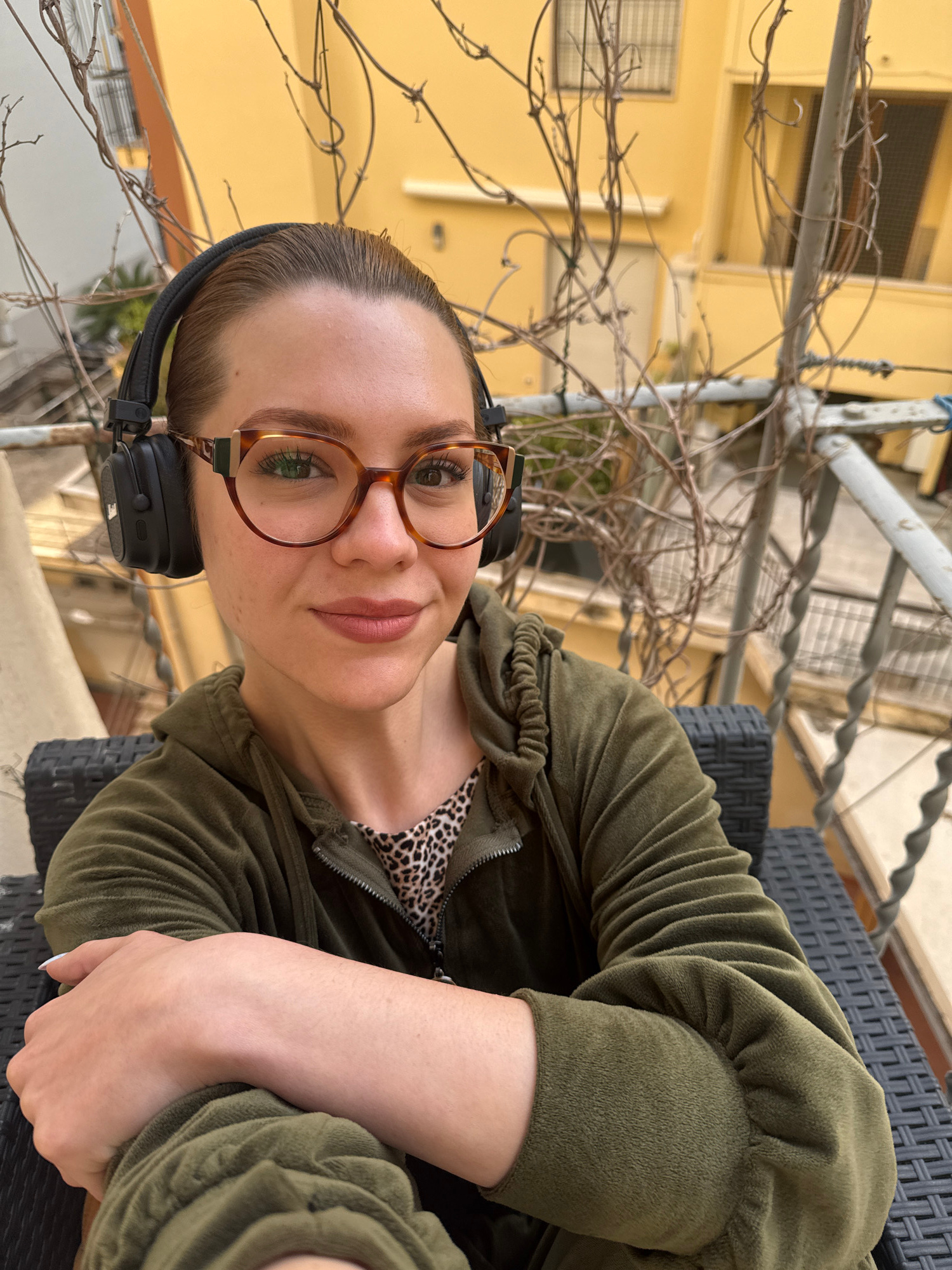 A woman with light skin, wearing glasses and headphones, sits on a black woven chair outdoors. She wears an olive green zipper jacket, which reveals a patterned garment underneath. She is situated on…read more