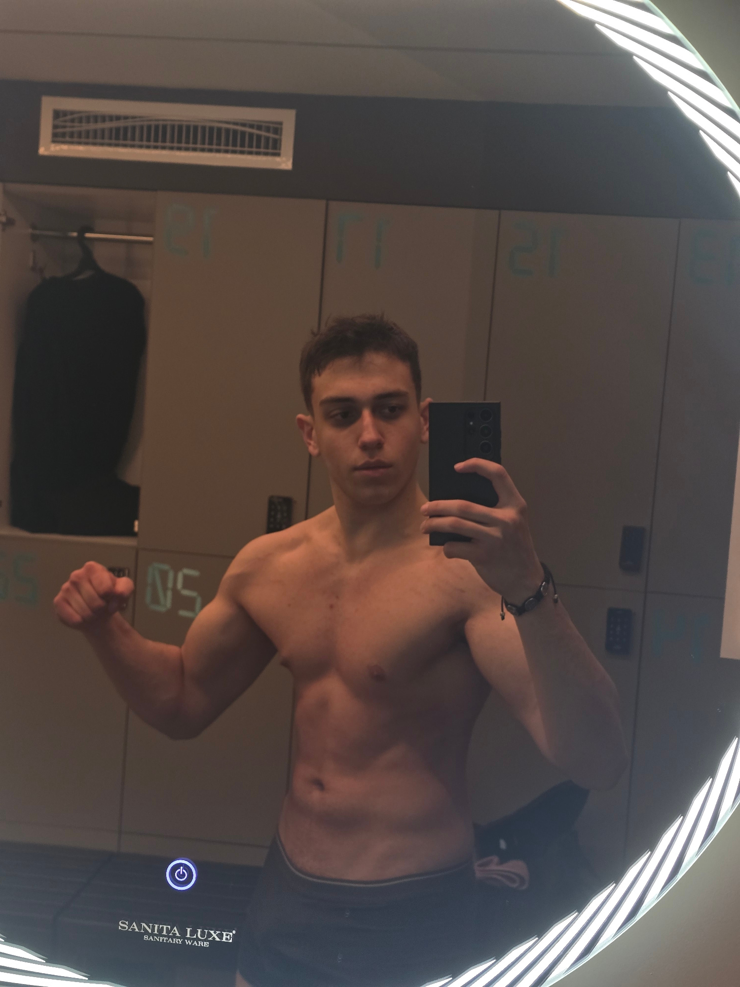 A shirtless man takes a selfie in a mirror in what appears to be a gym changing room. The man is facing the mirror at an angle, holding a smartphone in his right hand. He is wearing dark-colored short…read more