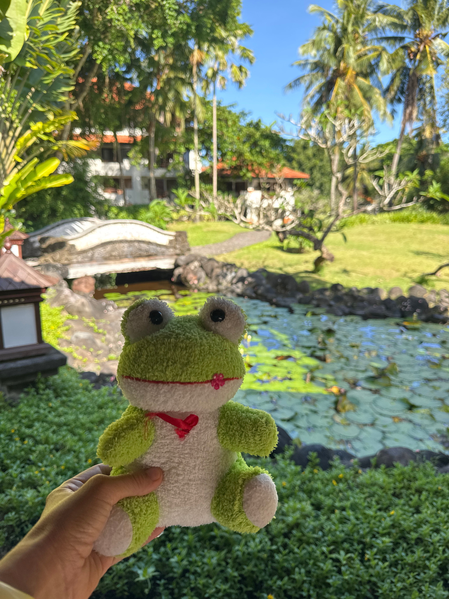 A person's hand holds a plush, white and green toy frog with a small red bow against an outdoor background. The setting appears to be a tropical garden, judging by the lush greenery, palm trees, and b…read more