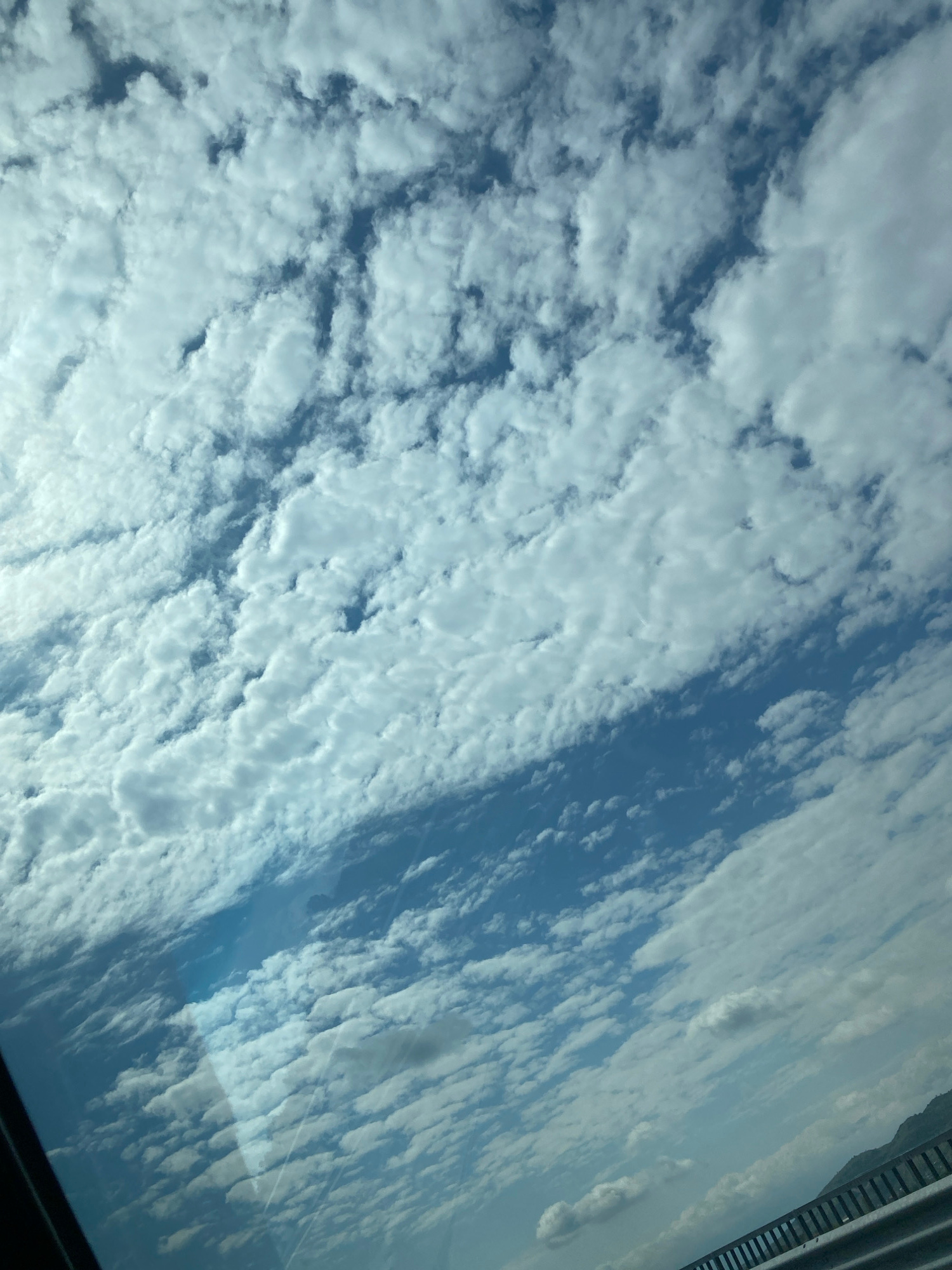 The image shows a sky filled with altocumulus clouds. Patches of blue sky are visible between the cloud formations. The scene is viewed through a window, as indicated by a reflection at the lower righ…read more