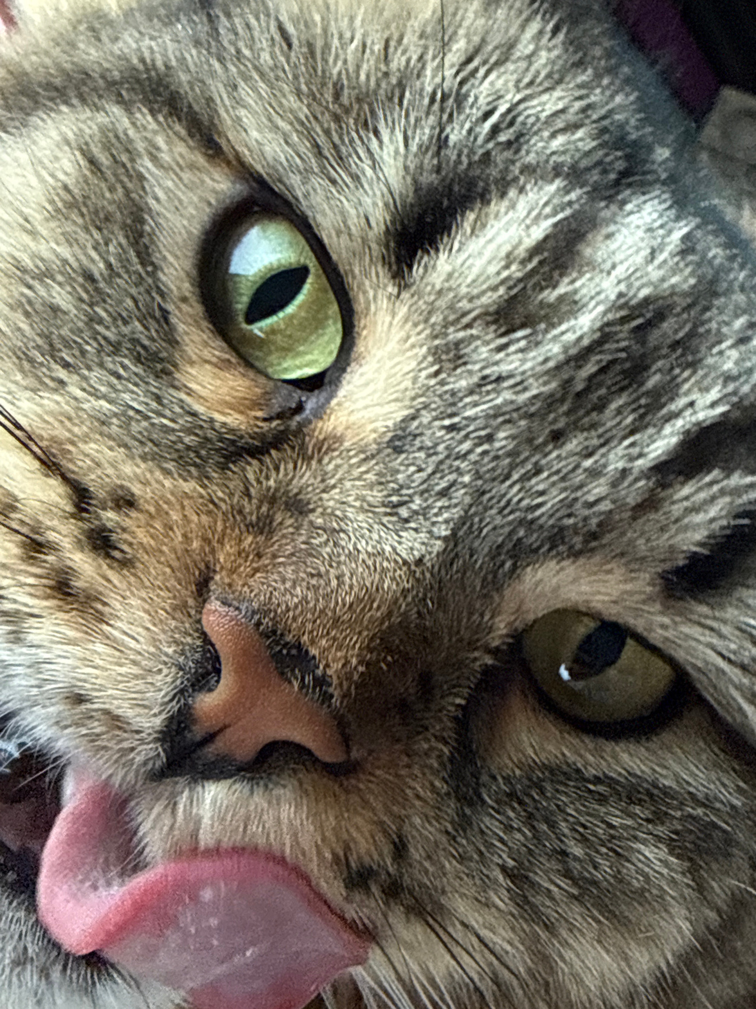 A close-up photograph shows a cat's face. The cat has tabby markings, green eyes, and a pink nose. Its tongue is extended to the side. The image does not contain enough information to determine the lo…read more