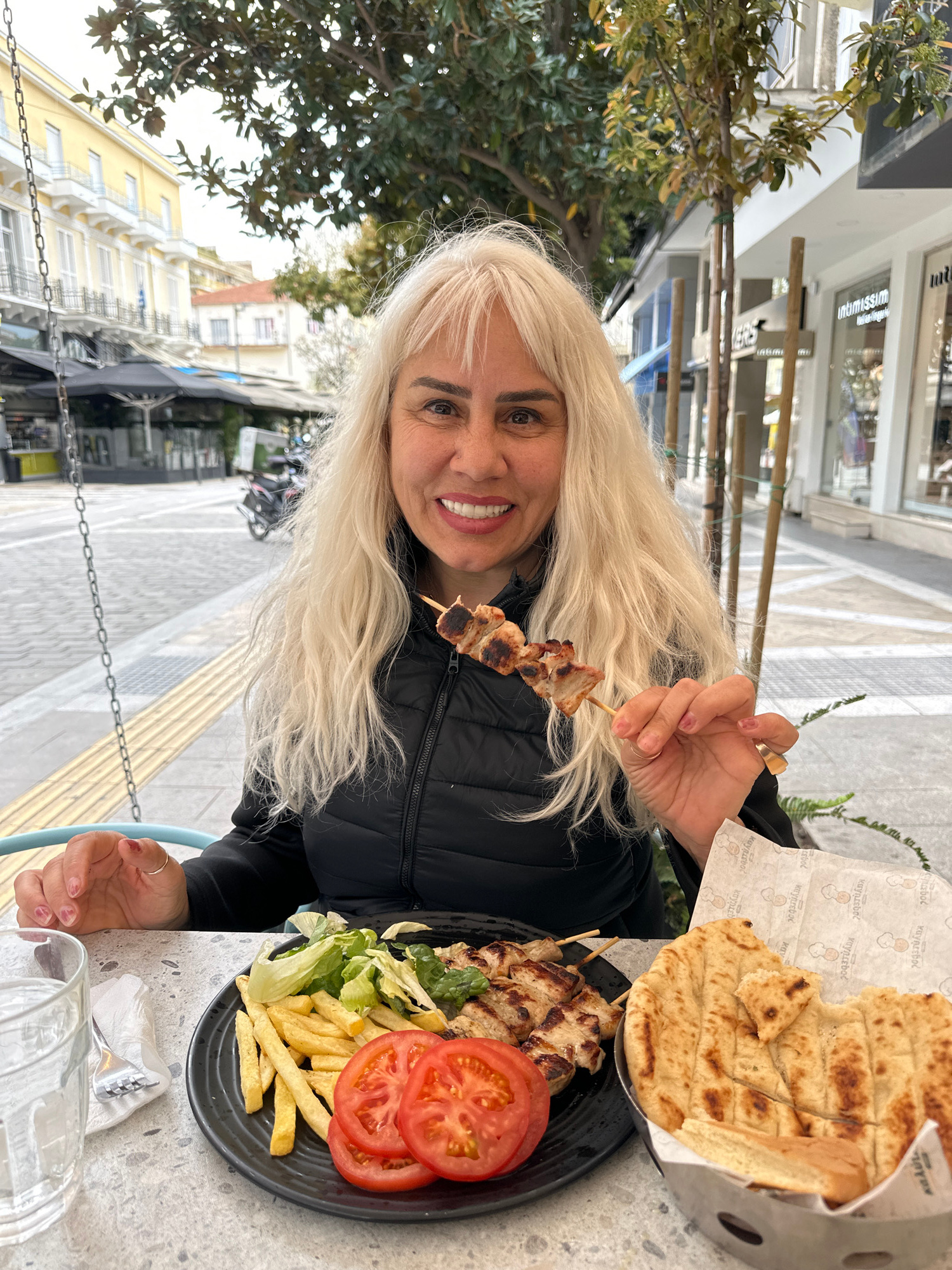 A woman with long blonde hair sits at an outdoor table in Serres, Greece, holding a skewer with grilled meat. She is wearing a black puffer jacket. On the table is a black plate with souvlaki skewers,…read more