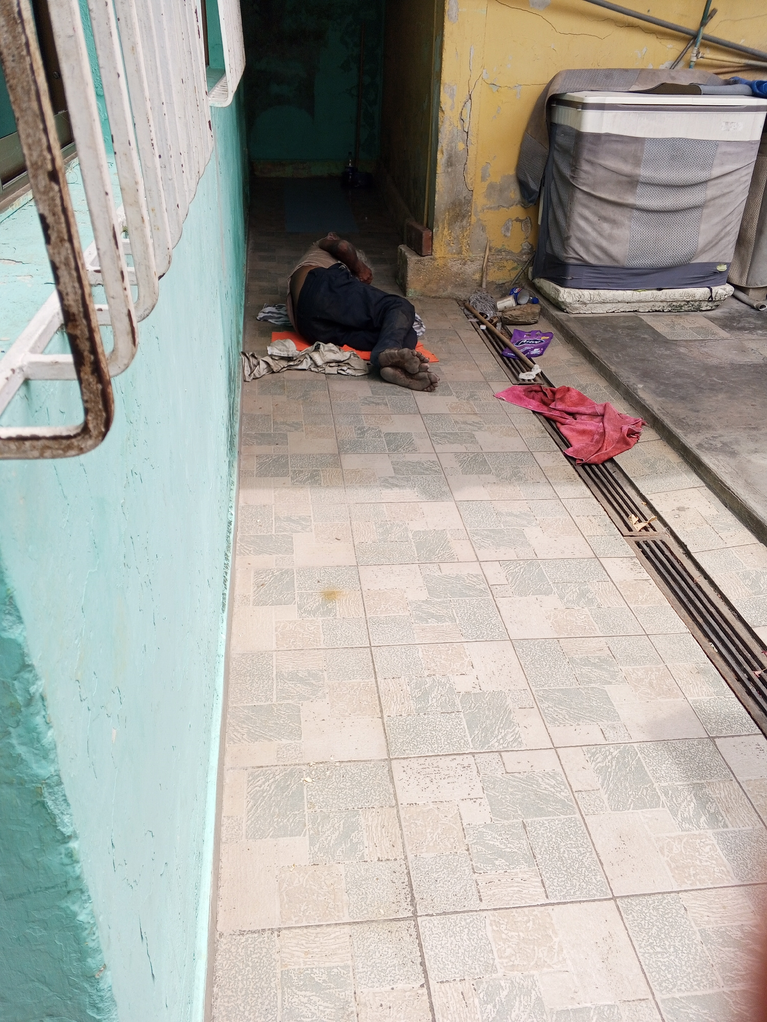 A man is sleeping on a tiled patio in Tinaquillo, Venezuela. He is lying on a makeshift bed of cloths and is wearing dark pants. His bare feet are visible. Next to him is a covered cooler, cleaning su…read more