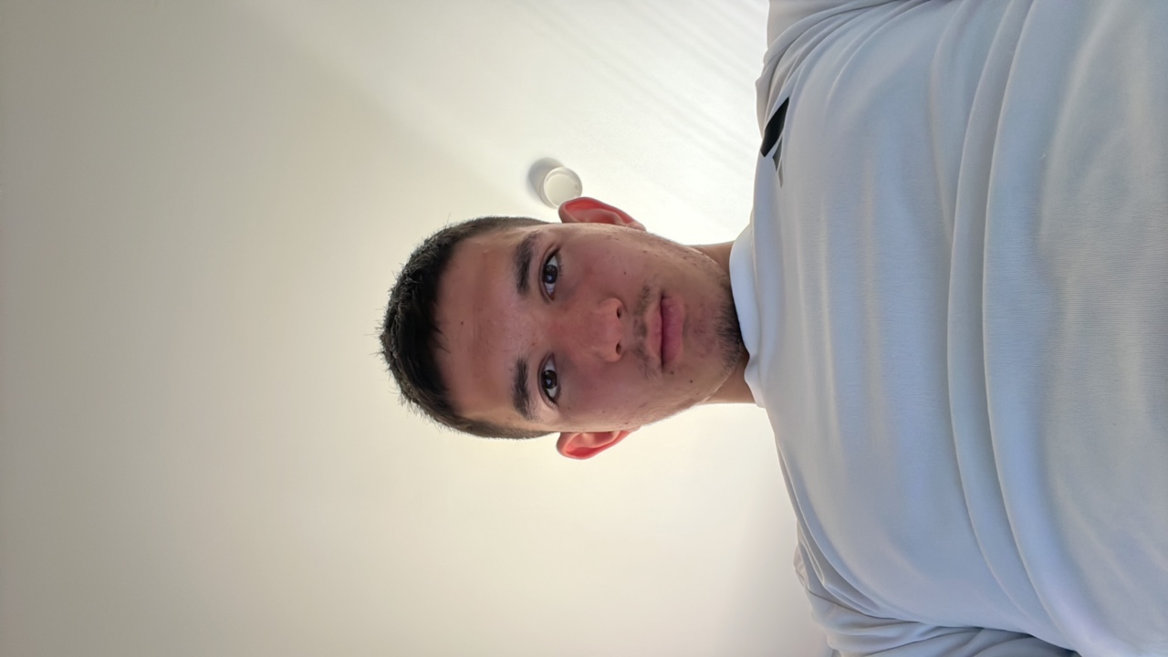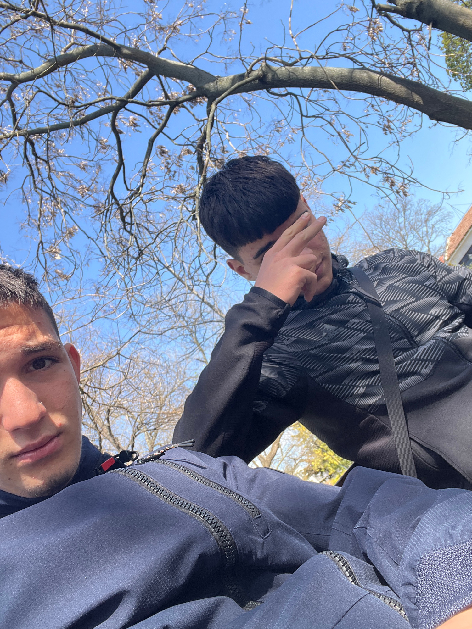 The image shows two young men outdoors on a sunny day. Bare tree branches fill the background against a clear blue sky. One man is closer to the camera, showing his face partially from below. Another…read more