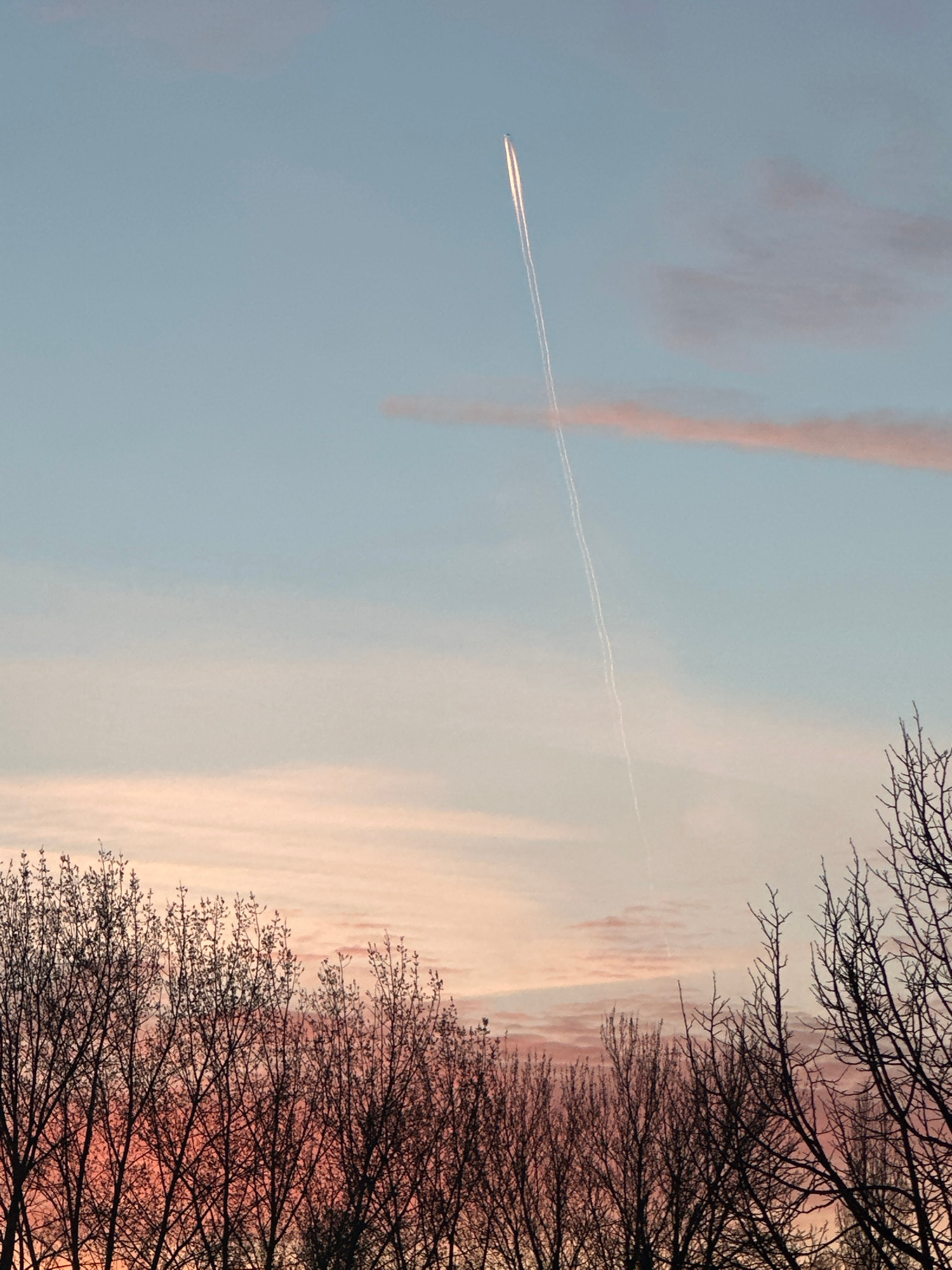 The image depicts a sky view over Tunbridge Wells, United Kingdom, at what appears to be either dawn or dusk. The sky occupies the majority of the frame, exhibiting a gradient from a light blue at the…read more