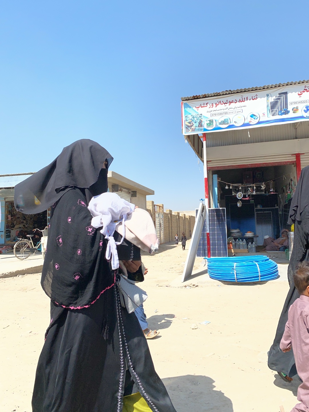 The photograph captures a street scene in Kandahar, Afghanistan, under a clear blue sky. A woman dressed in a full black burqa, typical of local custom, is seen carrying a bundle wrapped in white clot…read more