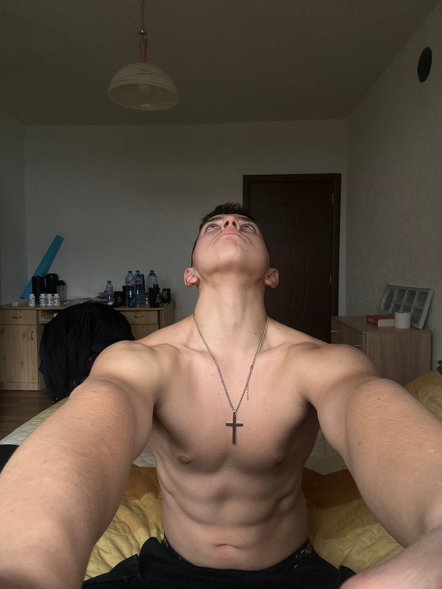 A shirtless man with a silver cross necklace is lying on a yellow and white bed. He is wearing black bottoms. The room contains furniture, including a wooden dresser with various items on it such as w…read more